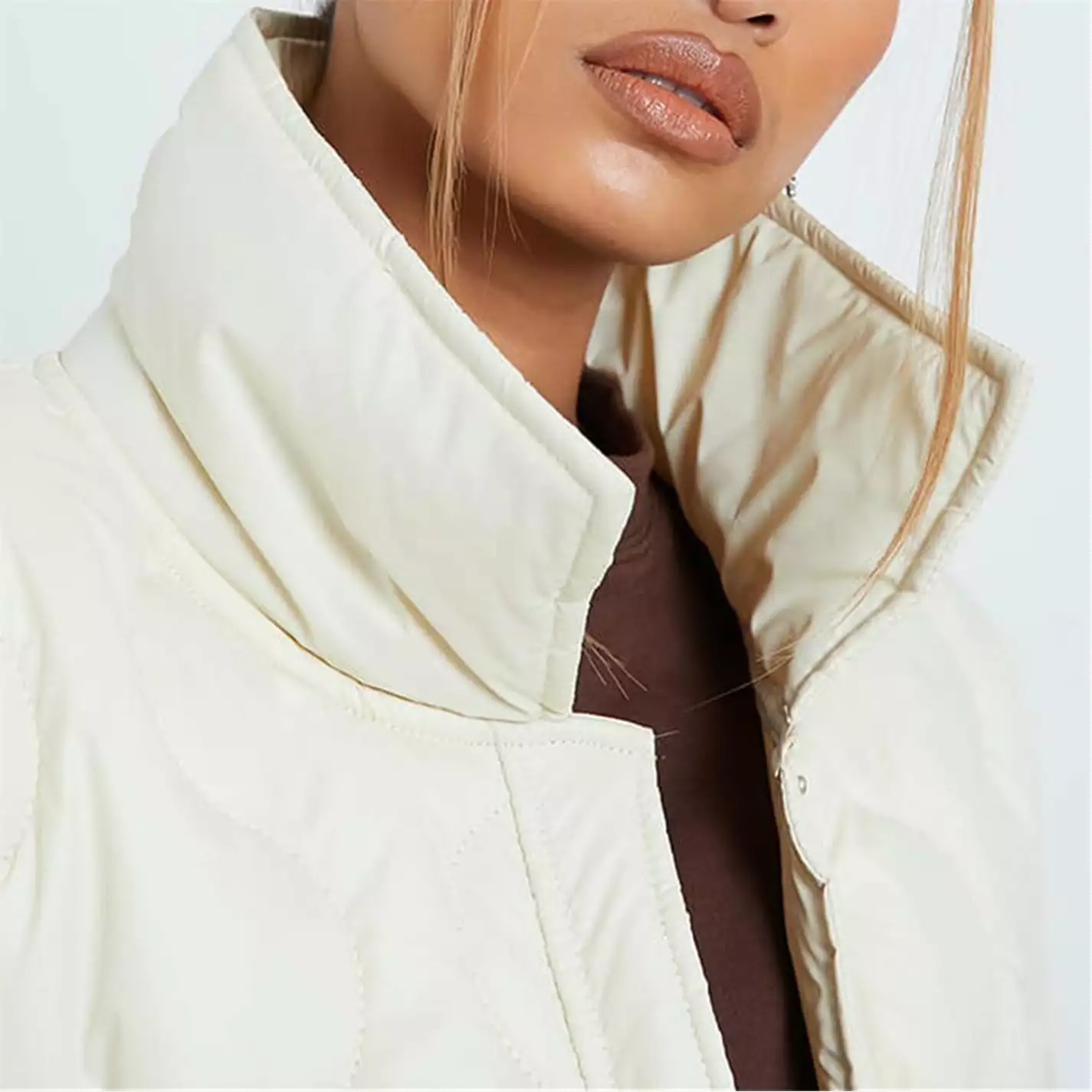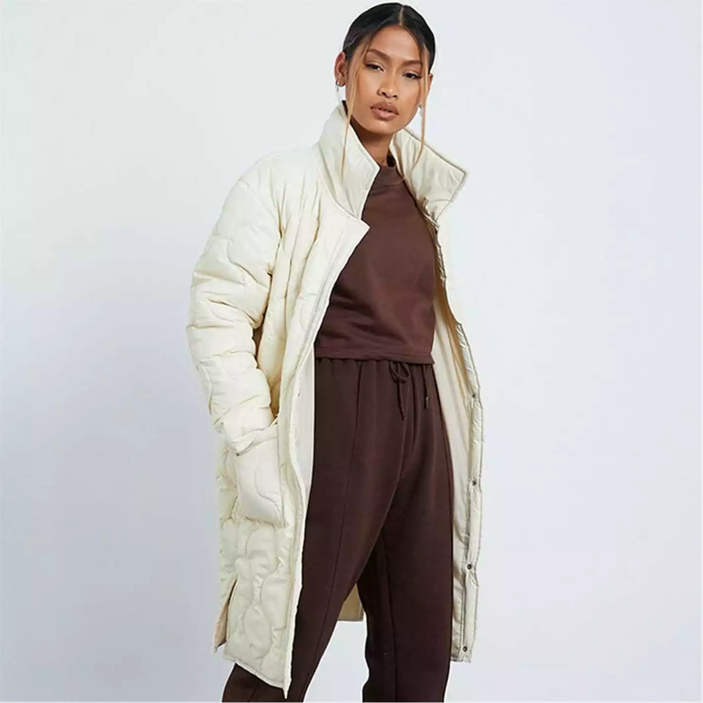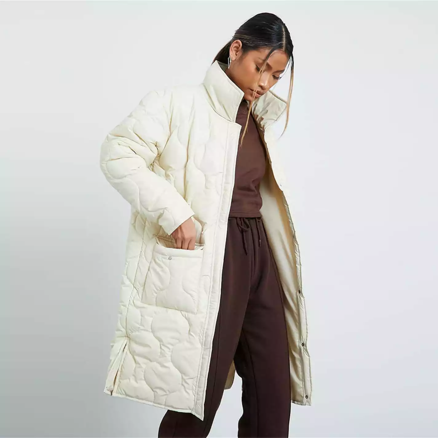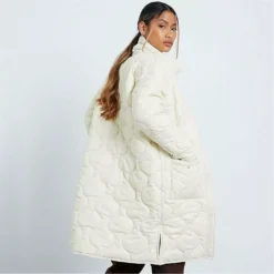 longline puffer shacket featuring high neck with onion quilted finish and large pocket detail.