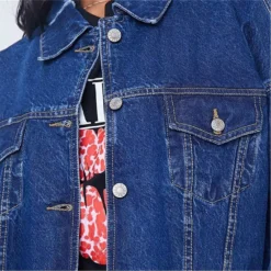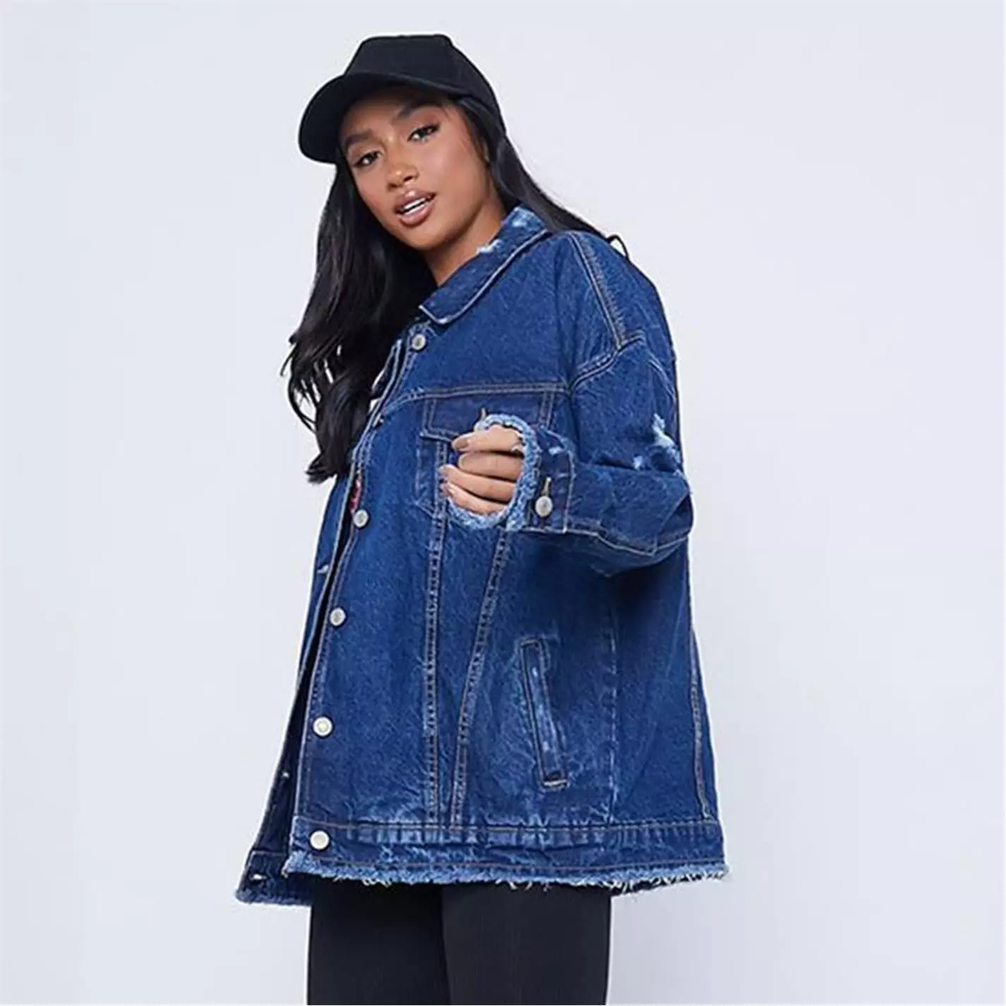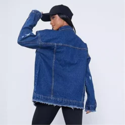 distressed denim oversized jacket with button front and pocket detail.