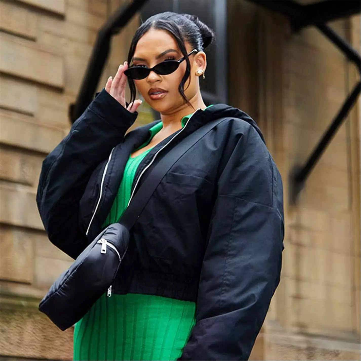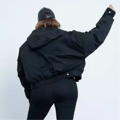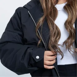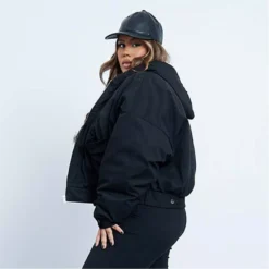 bomber jacket featuring a faux fur collar and hood, with zip up fastening and puff sleeves.