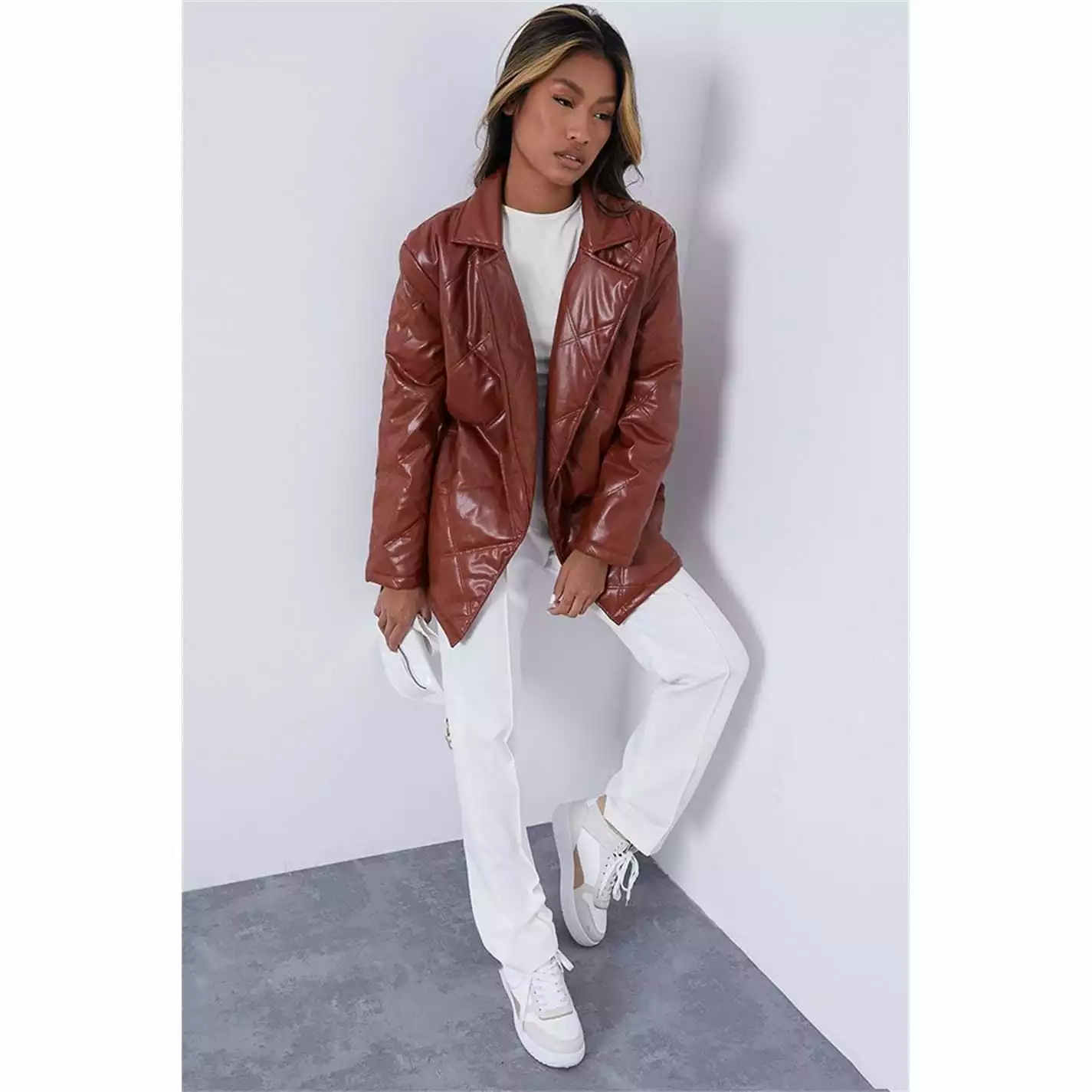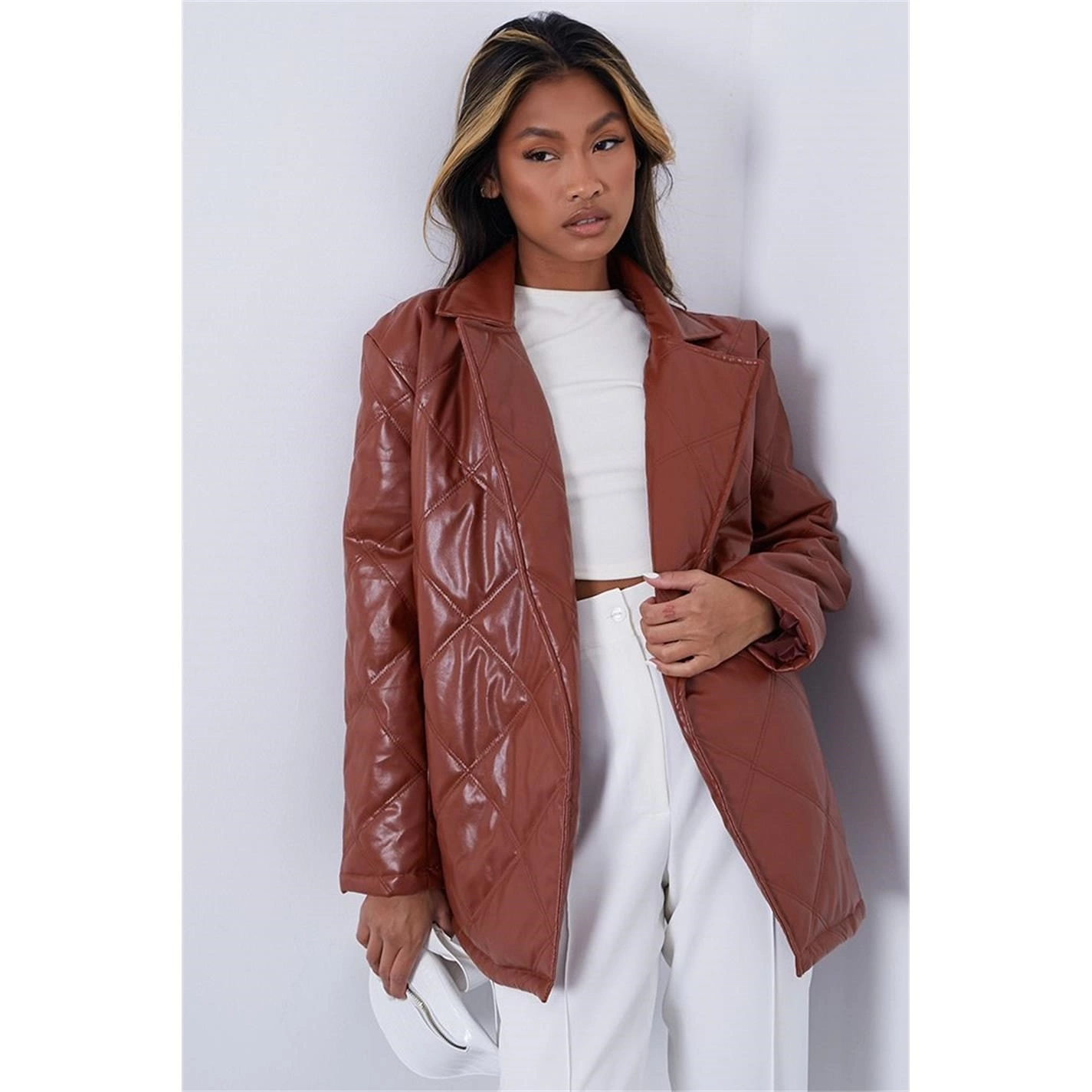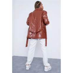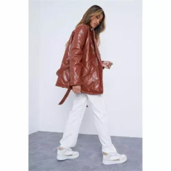 jacket in a quited padded style and faux leather finish. Features colalr neckline, front pockets and tie waist belt.
