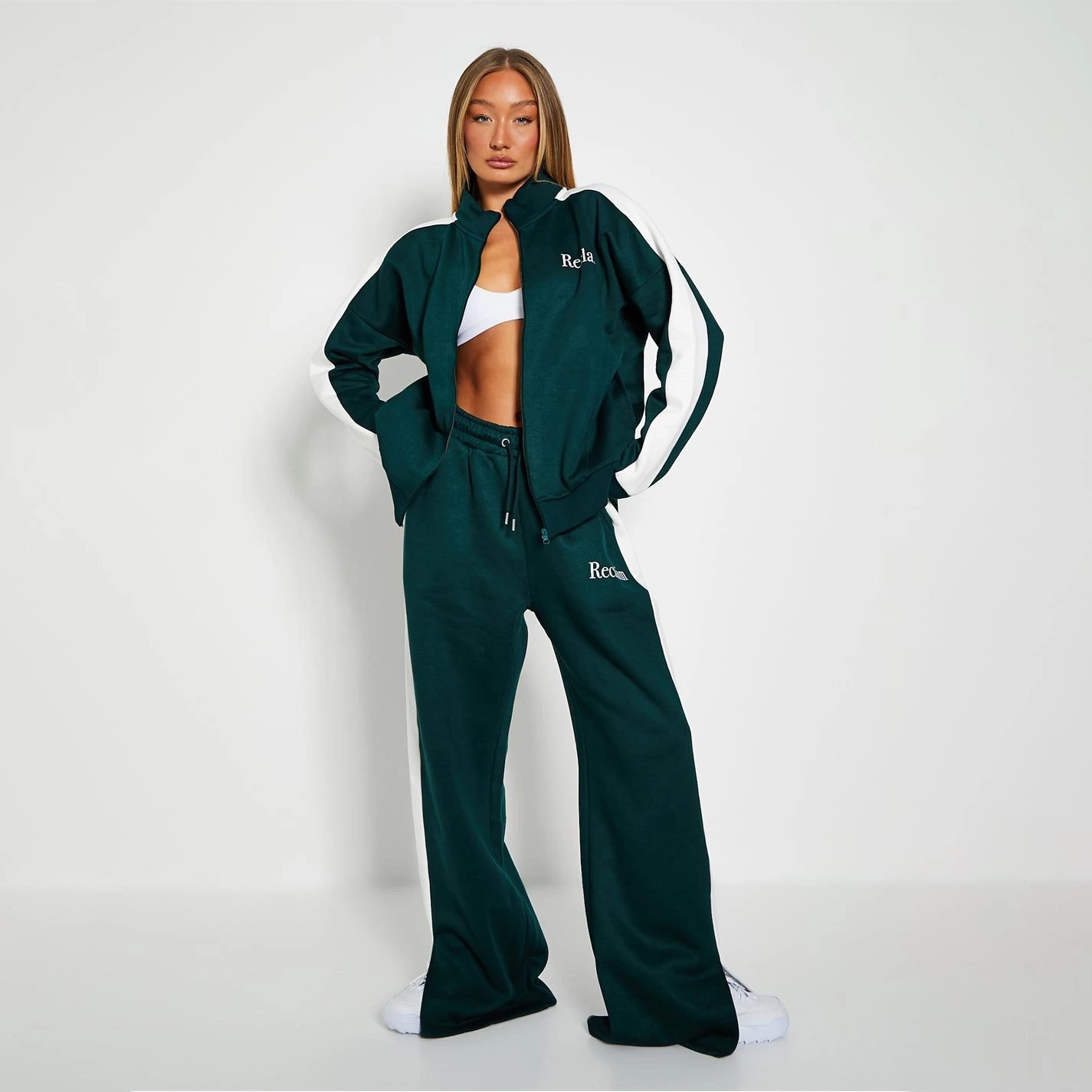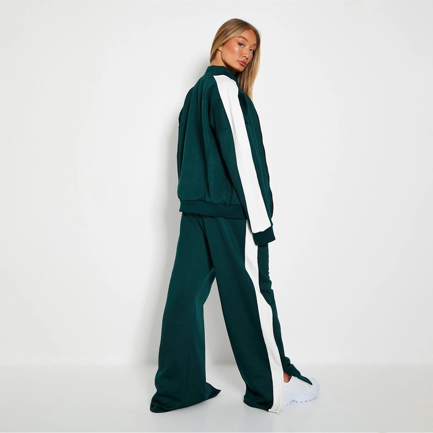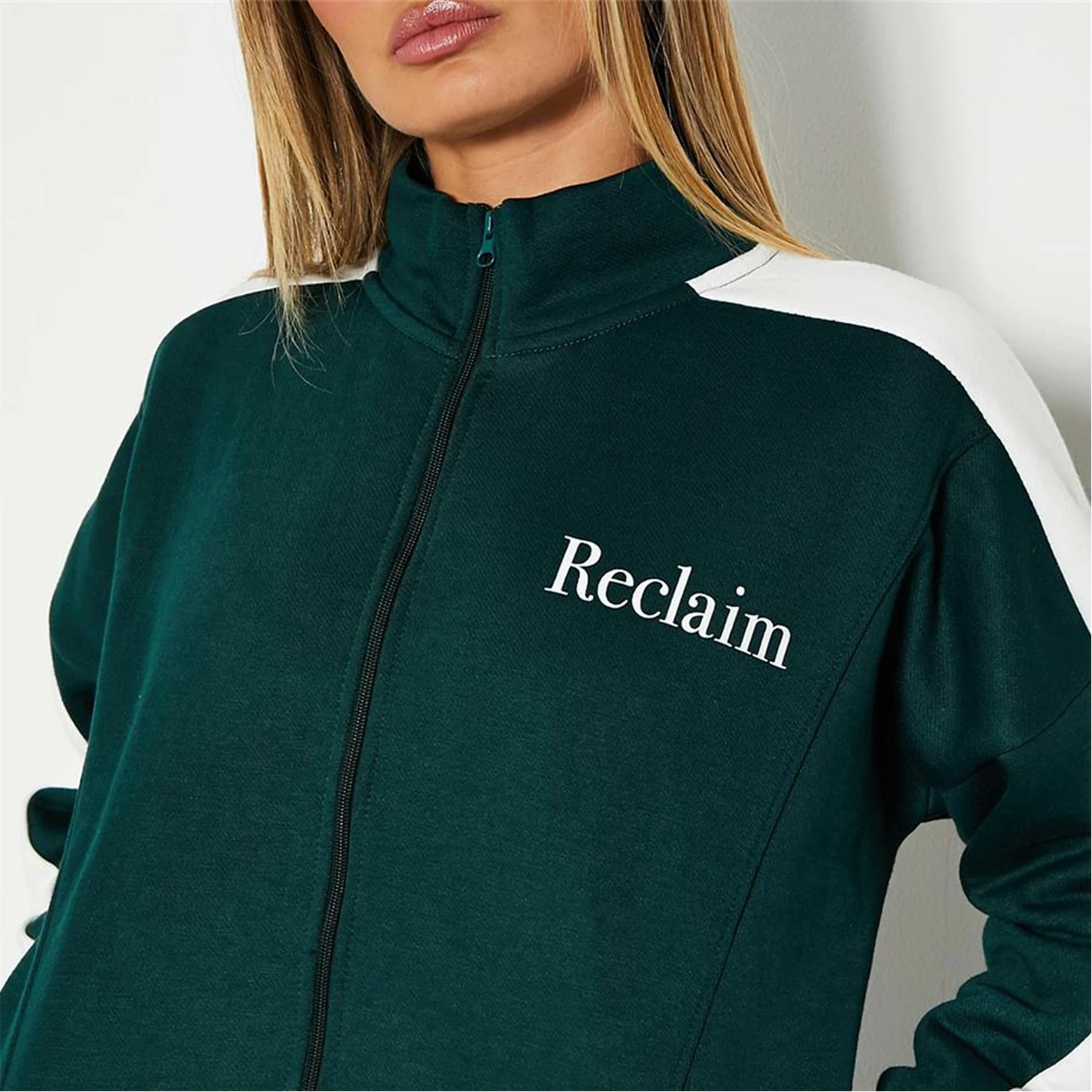 long sleeve zip through track jacket featuring side stripe and print detail.