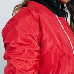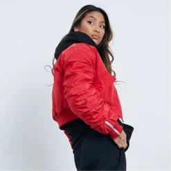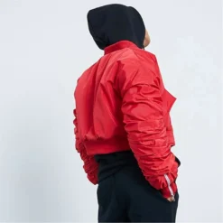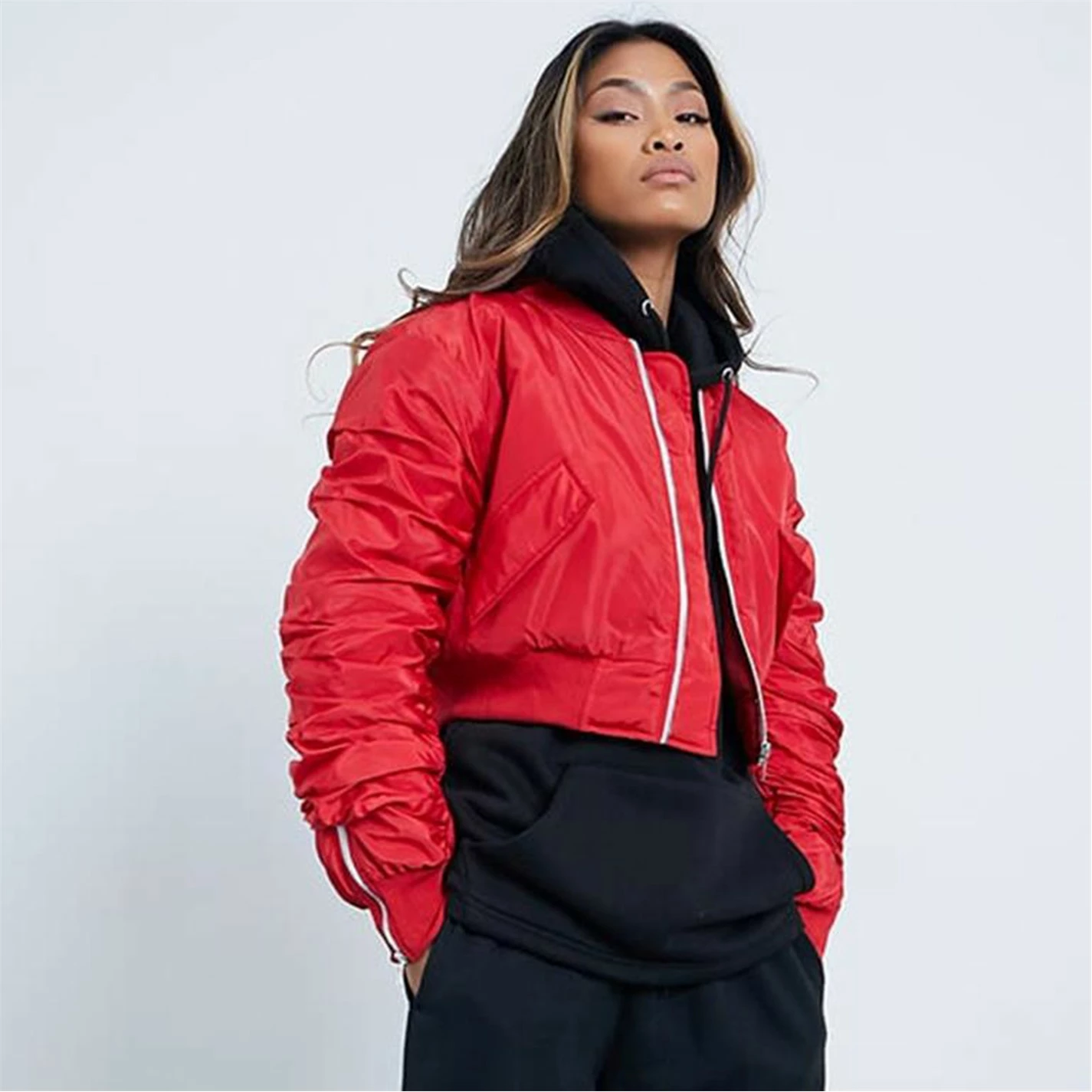 zip through padded bomber jacked featuring long ruched sleeves and faux pocket detail.