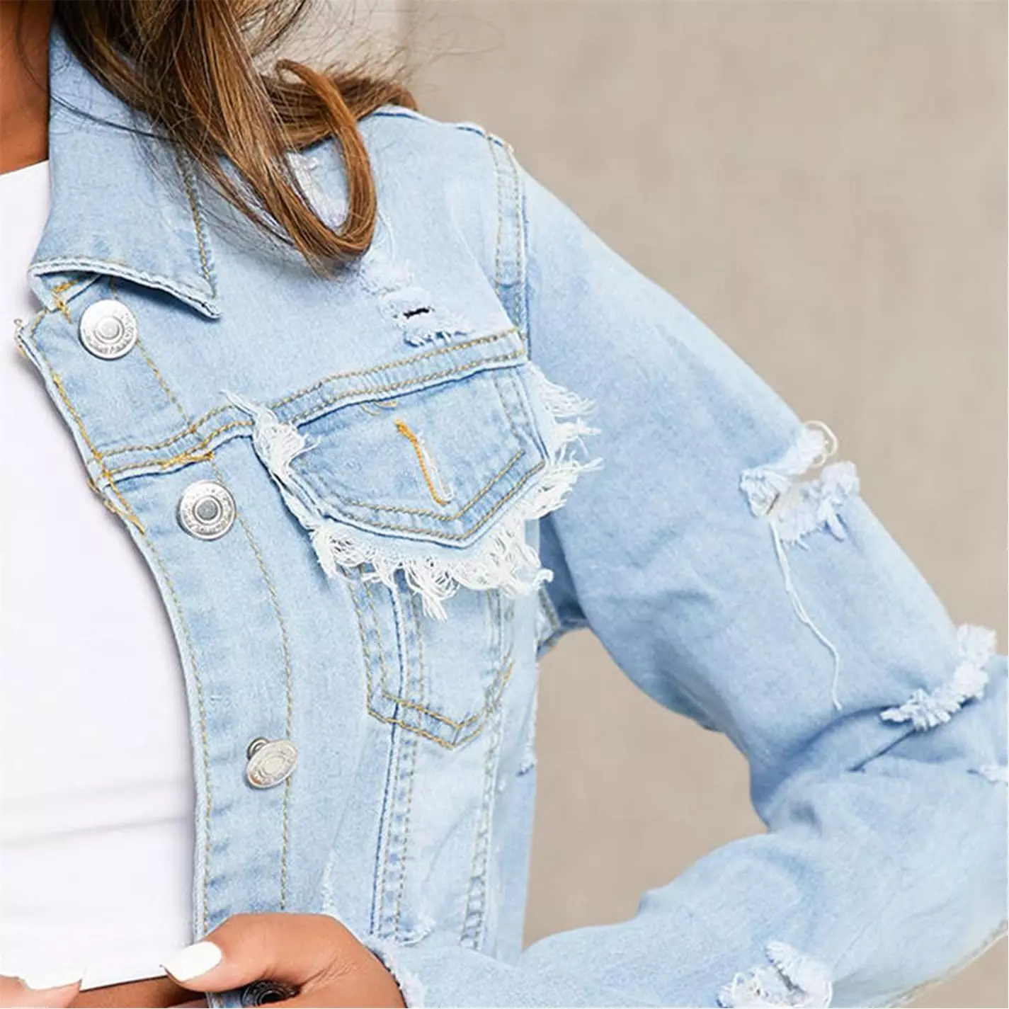 Denim jacket in a skinny fit with all over distressed details and raw hem.