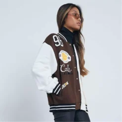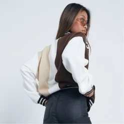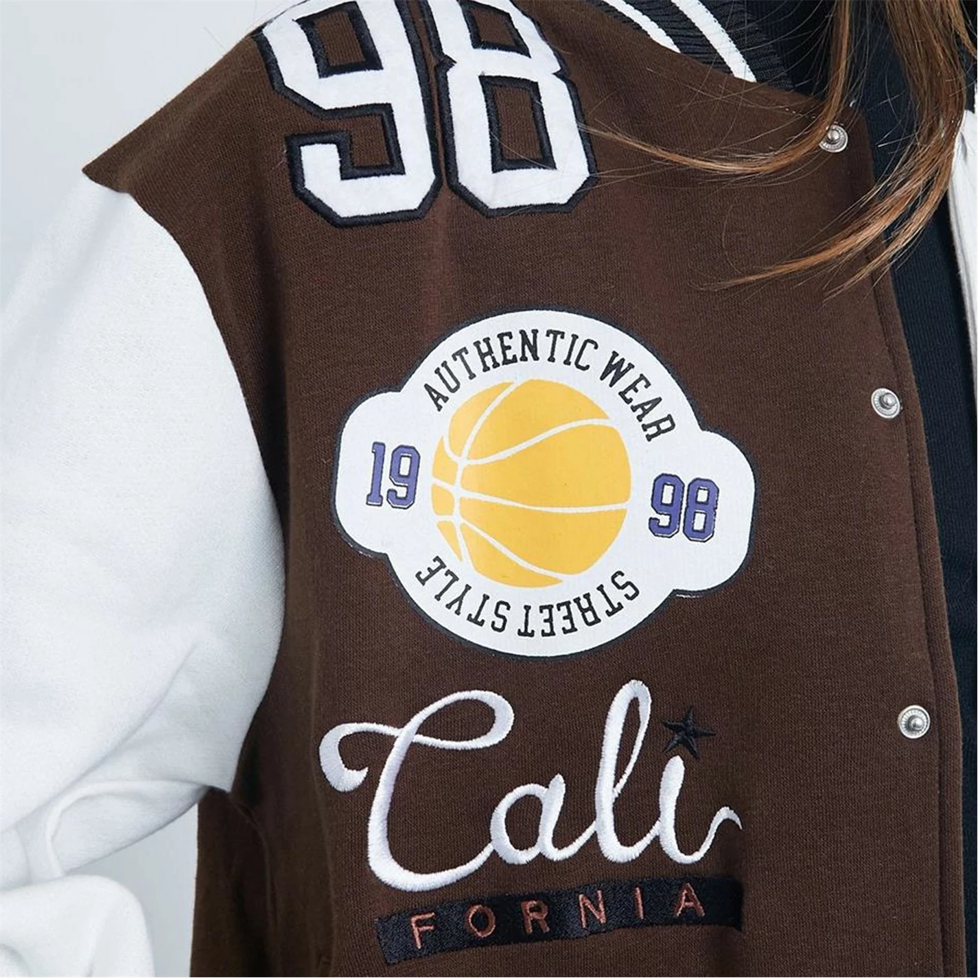 colour block spliced varsity style jacket in an oversized fit with popper front fastening, elasticated trims, front pockets and graphic slogan badge details.
