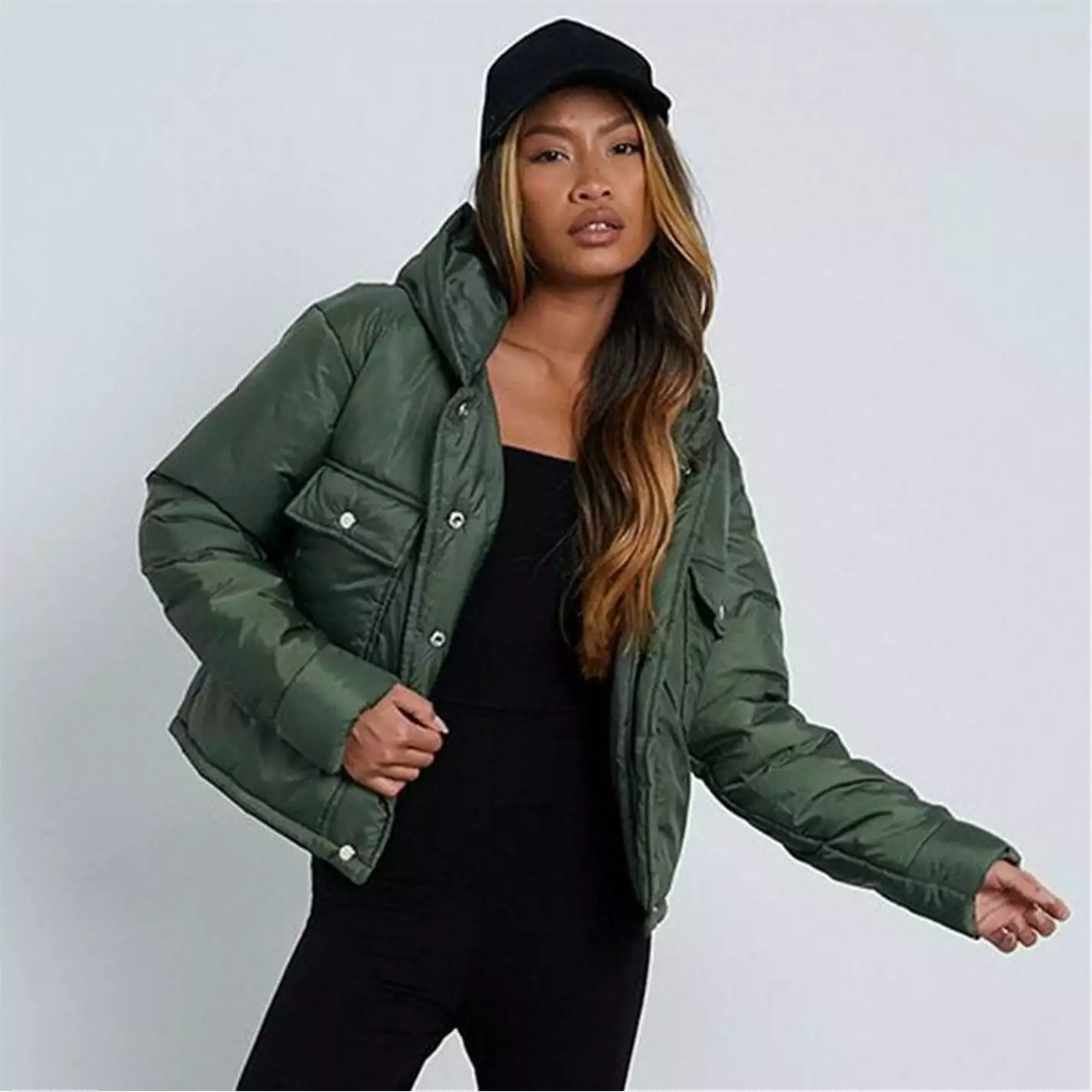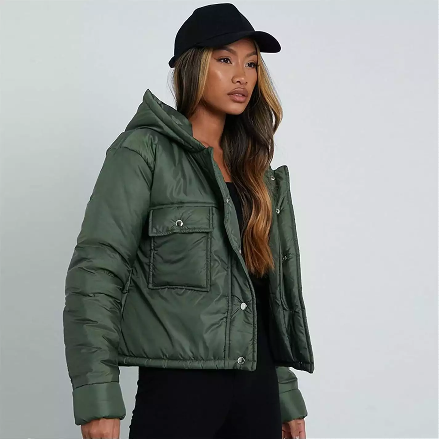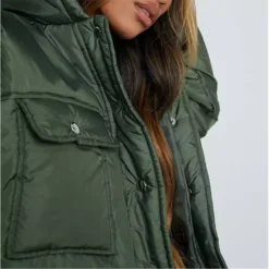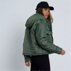 Jacket in a padded style with quilted finish, utility pockets and hooded feature.
