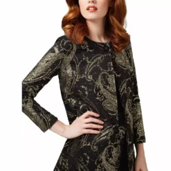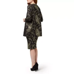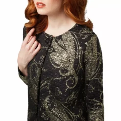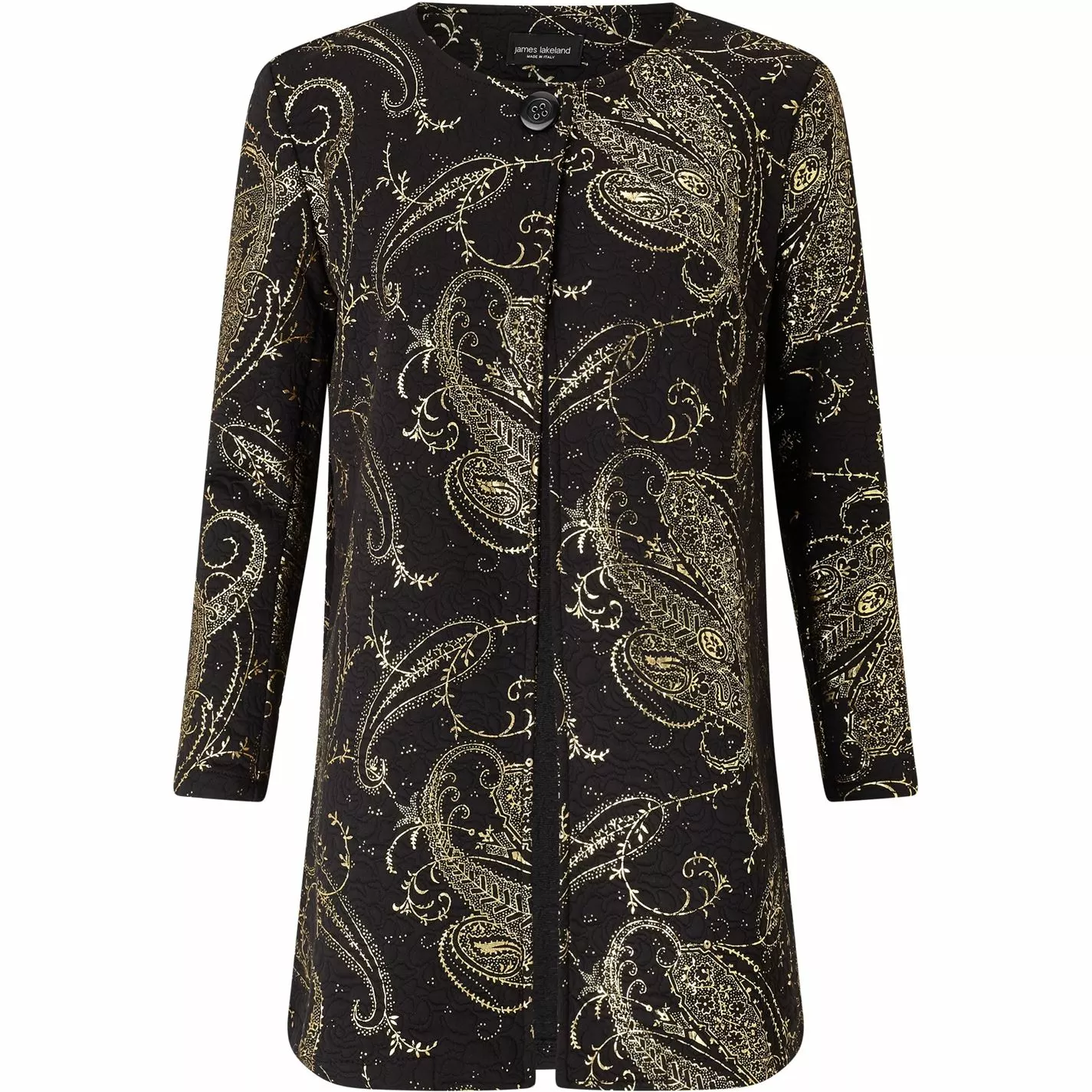 In A Striking Gold Baroque Print, This Jacket Will Be A Great Addition To Your Party Wardrobe. The Mid Length Jacket Has Long Length Sleeves And An Edge To Edge Open Front With A Single Button Fastening.