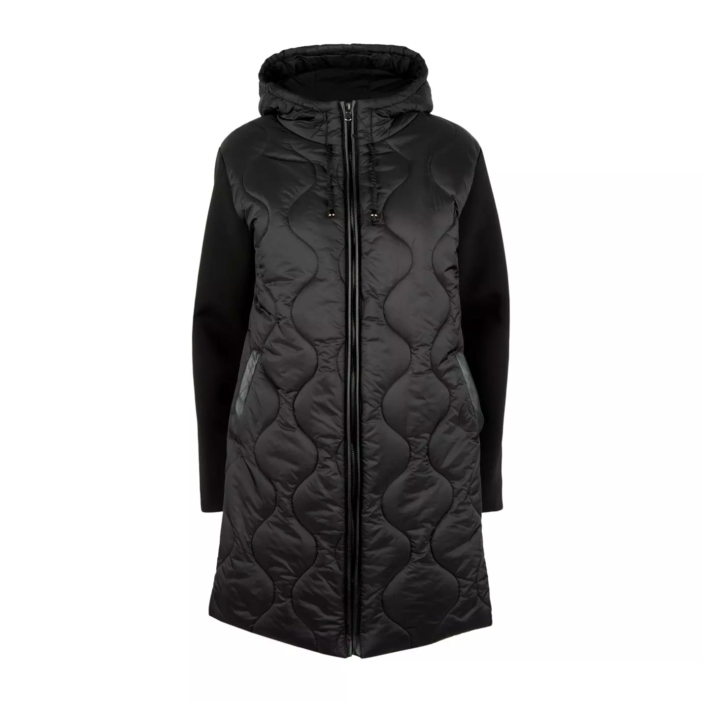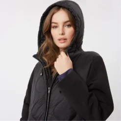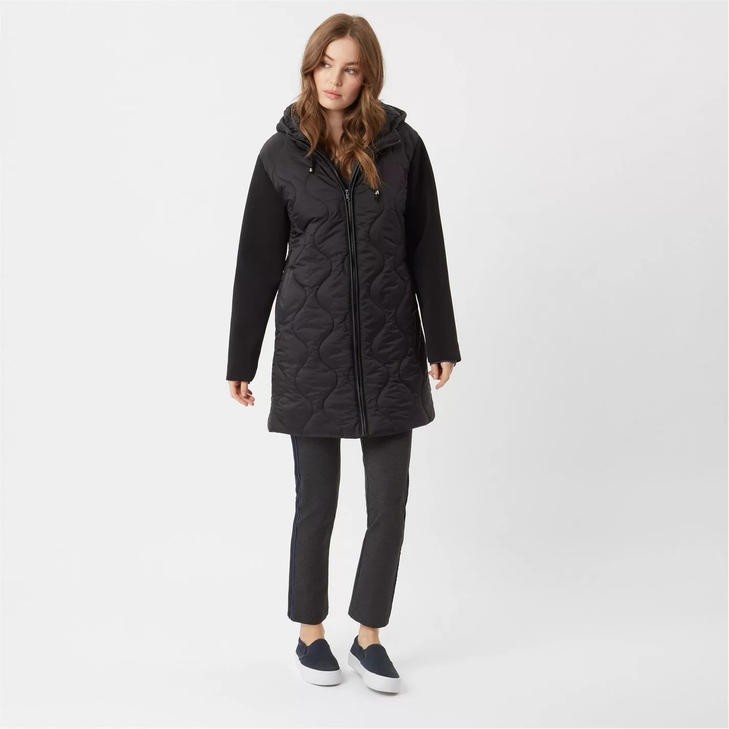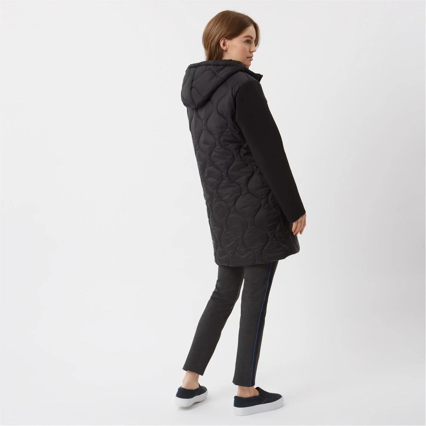Featuring a contrasting neoprene sleeve this puffa jacket is an essential for your winter wardrobe. Finished with a hood and the perfect cut for a flattering fit. Falls mid thigh.