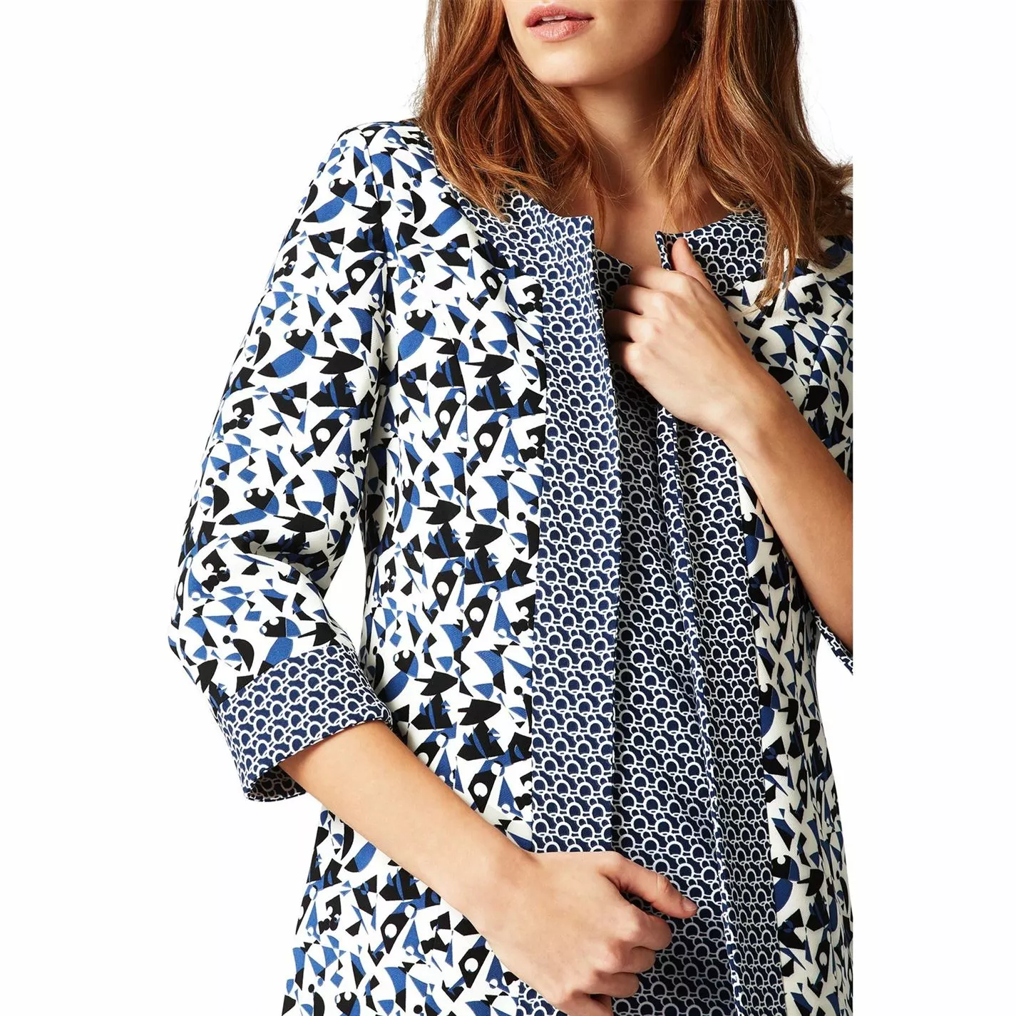 This contemporary longer-length jacket features an all-over printed design, 3/4 length sleeves and open front. It is fully lined and a matching items are available.