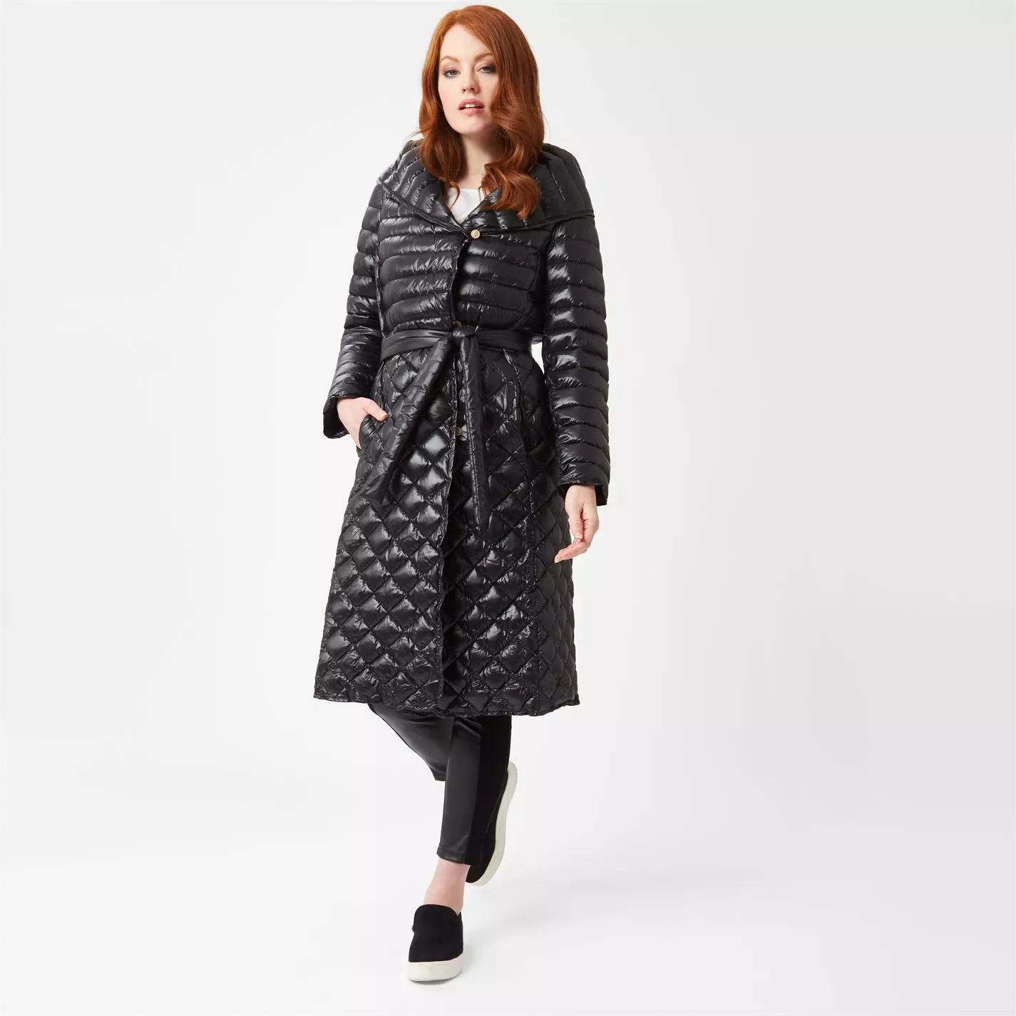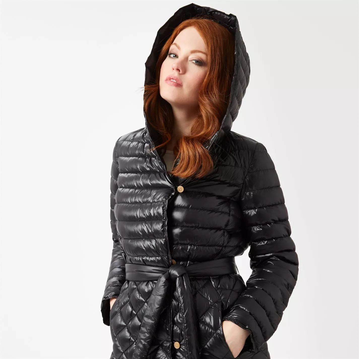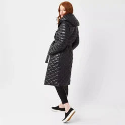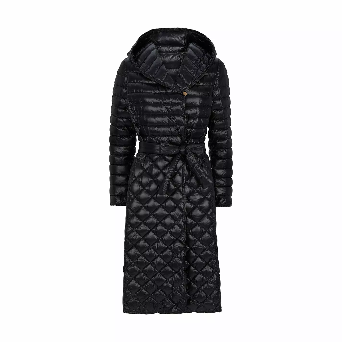 For a light weight long puffer for when the winter weather sets in, this midi, hooded option will not only keep you warm, but elegant too. Featuring chic small front buttons, belt, cut in an A-line fit. Finished with a mix of horizontal stitching at the top and diamond design at the bottom.