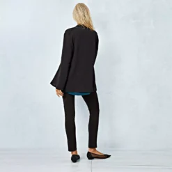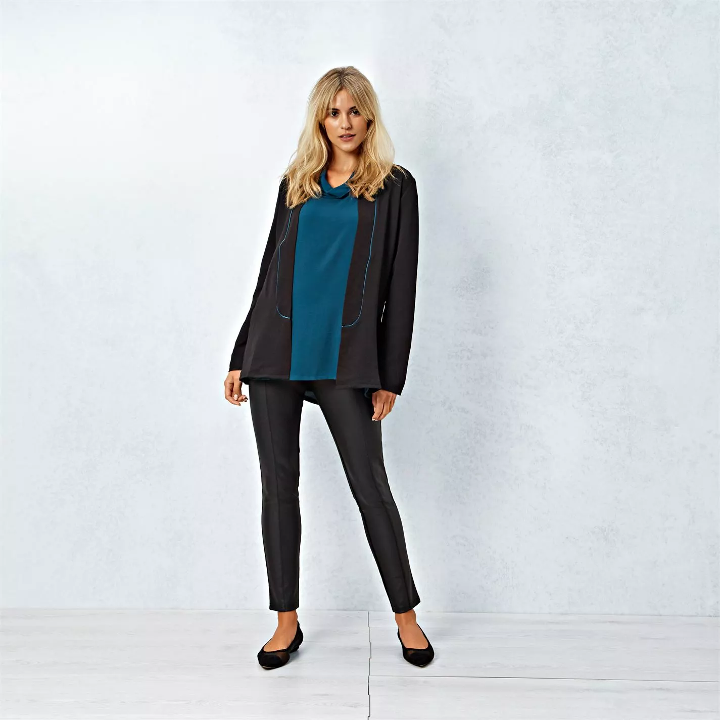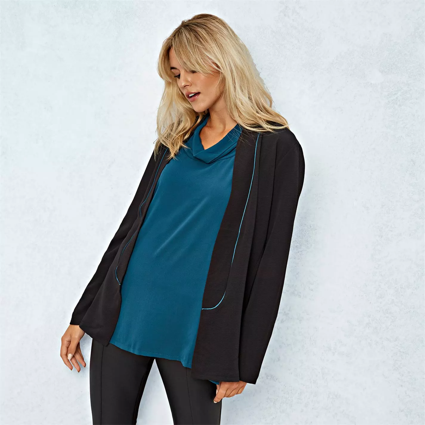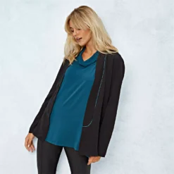 This chiffon style jacket is cut to a relaxed tailored shape, featuring piping around the collarless neckline. It’s the perfect addition to your workwear wardrobe when paired with slim fit trousers.