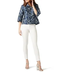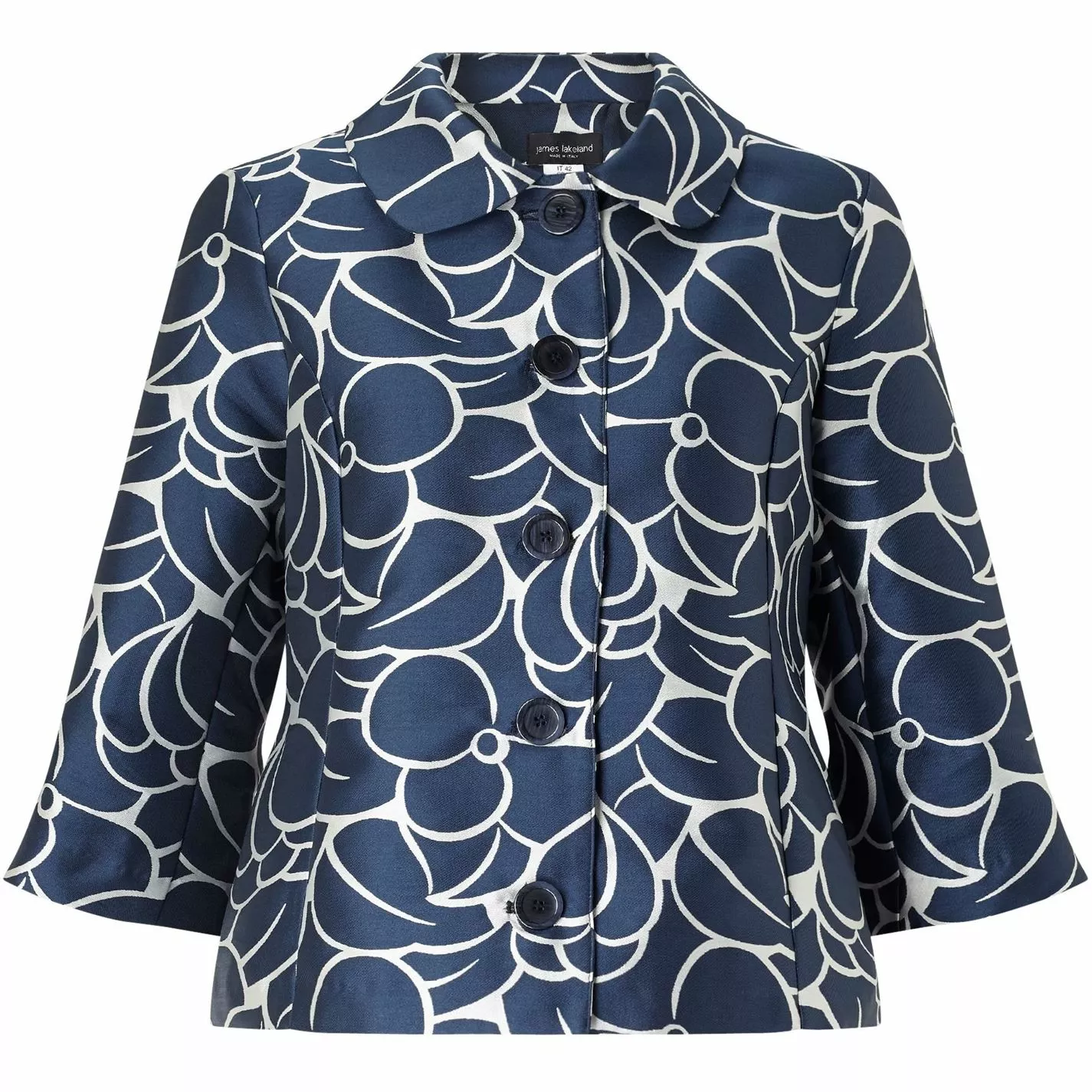 This cropped occasion jacket is in a beautiful jacquard. It is fully lined with 3/4 sleeves and fastened with buttons down the centre. Matching dress available.