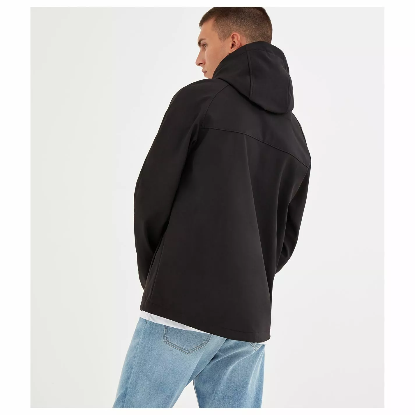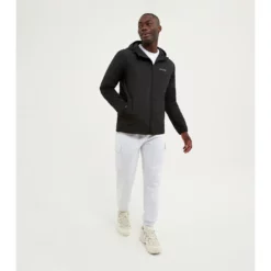 In a short length design with dropped back. Soft shell fleece lined fabric featuring a concealed front zip, hood with adjustable cords and a small reflective logo. The jacket also has three handy zip pockets, one at the