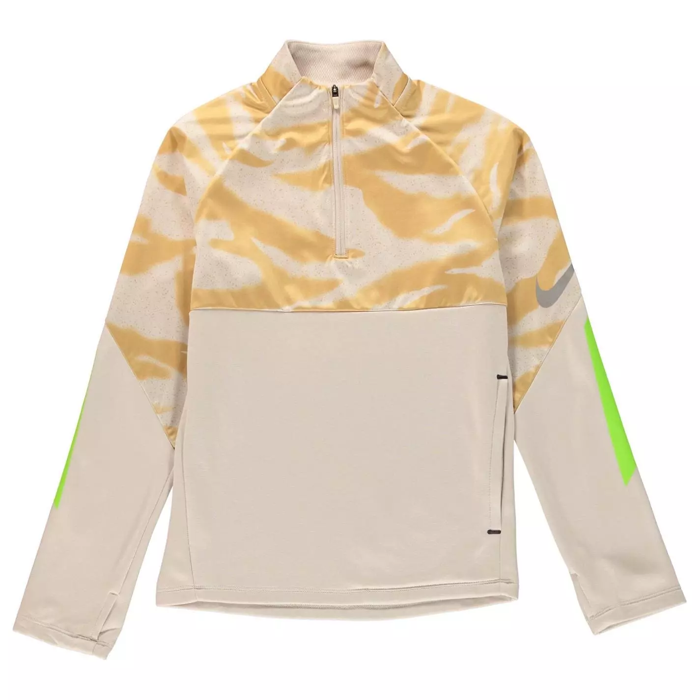 Let your little one play their best with this Nike Thermal Shield 1/4 Zip Jacket. The jacket features 1/4 zip closure with a funnel neckline, long sleeves and thumb holes on the cuffs with a water resistant shell DriFit technology to wick sweat away from the body. There is 1 side zip pocket with a solid colour throughout, reflective elements and Nike branding along the sleeve to finish the look.