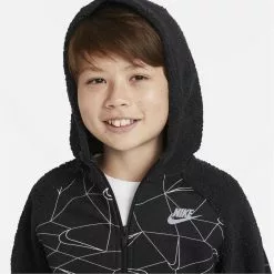 The Kids Nike Winterised Jacket is a great addition to their outerwear wardrobe, crafted with a full zip fastening coupled with an elasticated trim to the wrist cuffs and hem for all day comfort. Two zip fastening hand pockets provides ample space for all your essentials, a patterned design to the main body along with a lined hood and the Nike Swoosh branding completes the look.