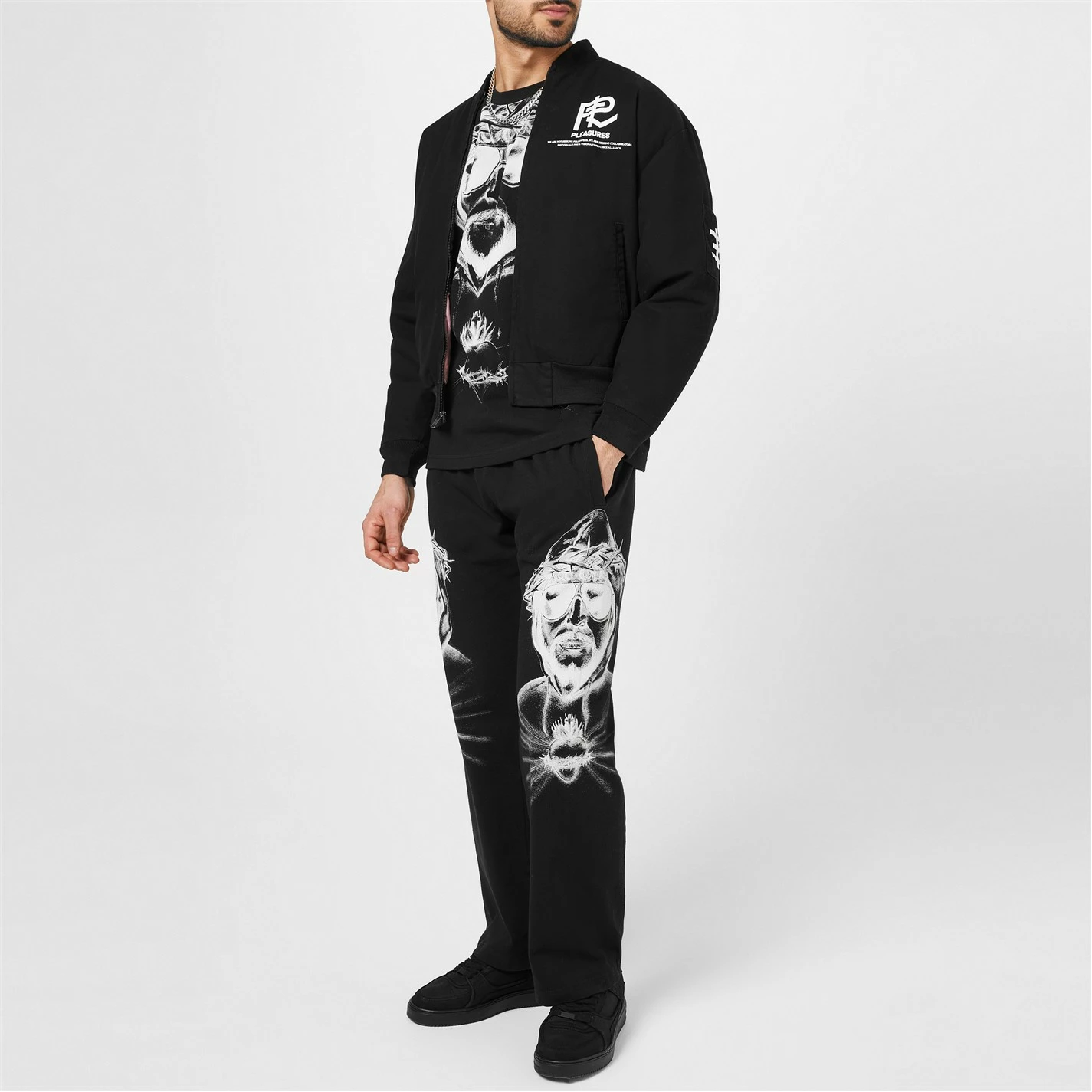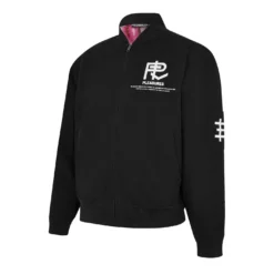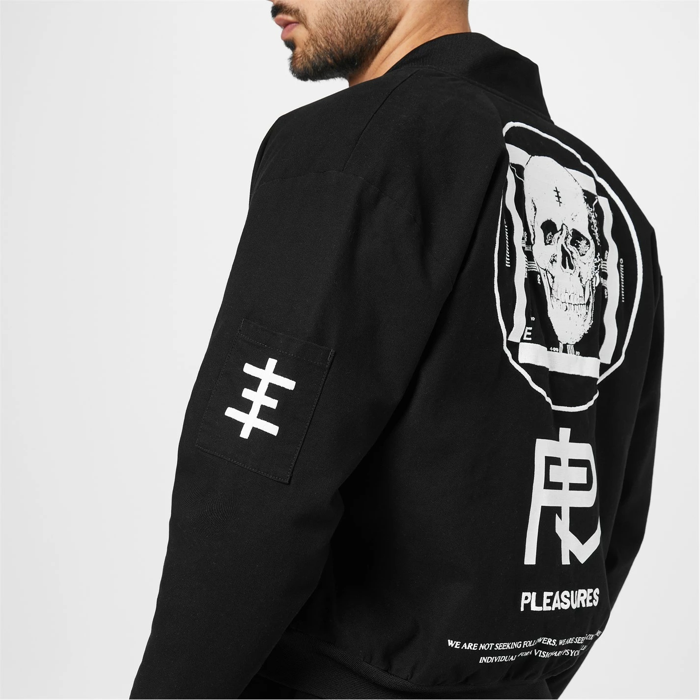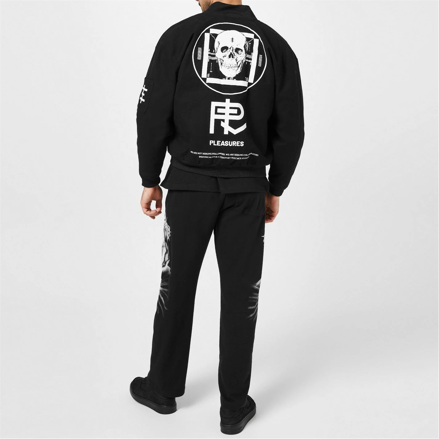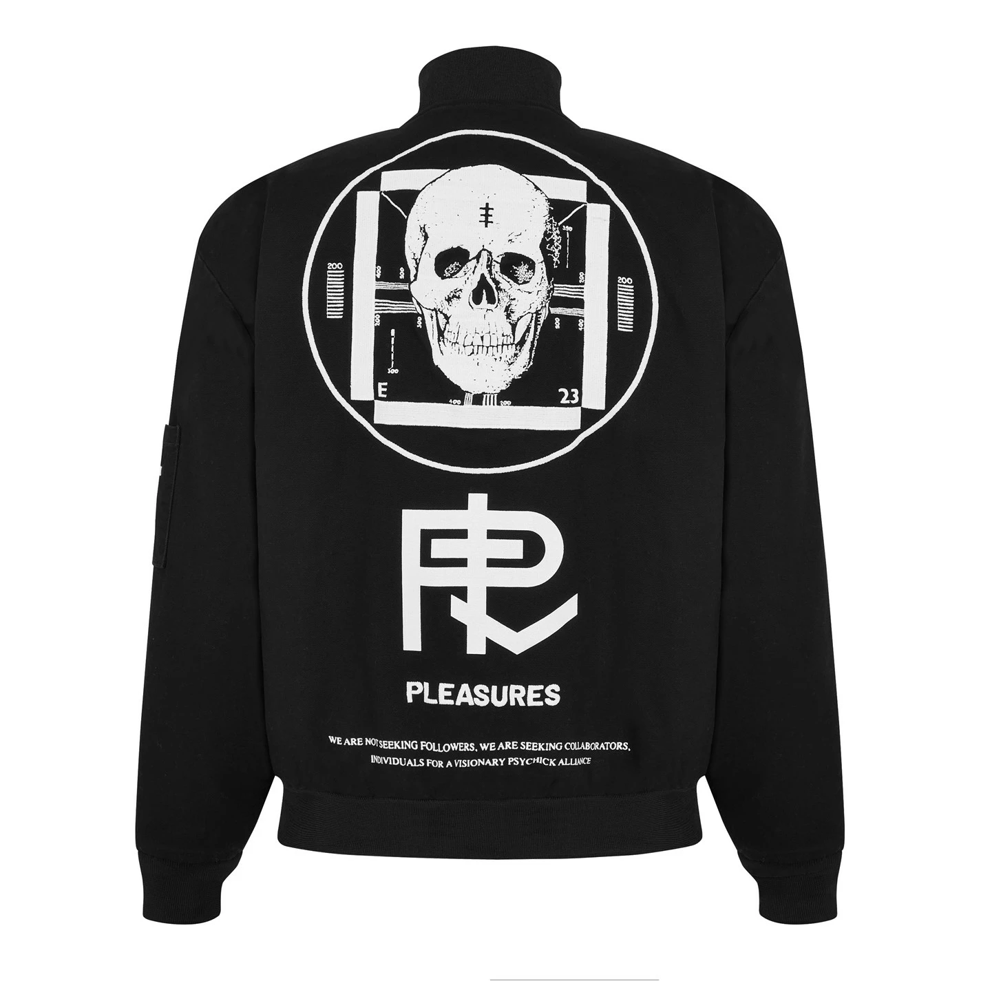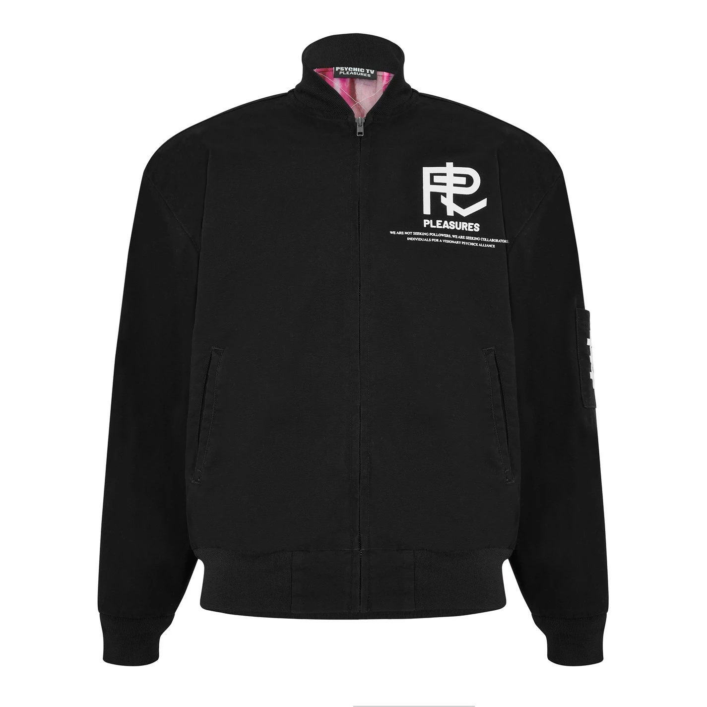 Update your streetwear staples with the Bomber Jacket brought to you by Pleasures. In a Pleasures X Psychic TV Visionary collaboration, the piece is designed with a classic bomber silhouette in a durable cotton canvas composition. Featuring a front full zip fastening, twin front pockets and a bomber collar, the monochromatic piece features printed and embroidery detailing throughout for a design element and brand appreciation with every wear. Dry clean only. Composition: 98% Cotton, 2% Spandex.