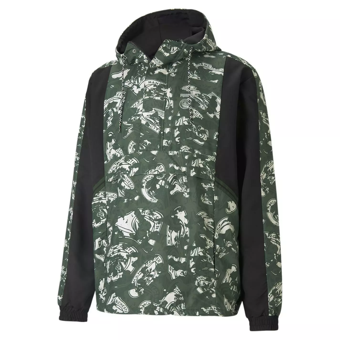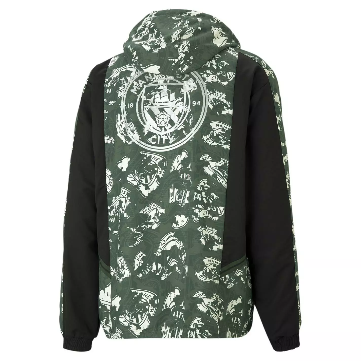 This Puma Manchester City FC Zip Jacket is crafted with half zip fastening and long sleeves with elasticated hems for a comfortable fit. It features a drawstring adjustable hood and a kangaroo pocket for a classic look. This jacket is an all over print design with a signature logo and is complete with Puma branding.