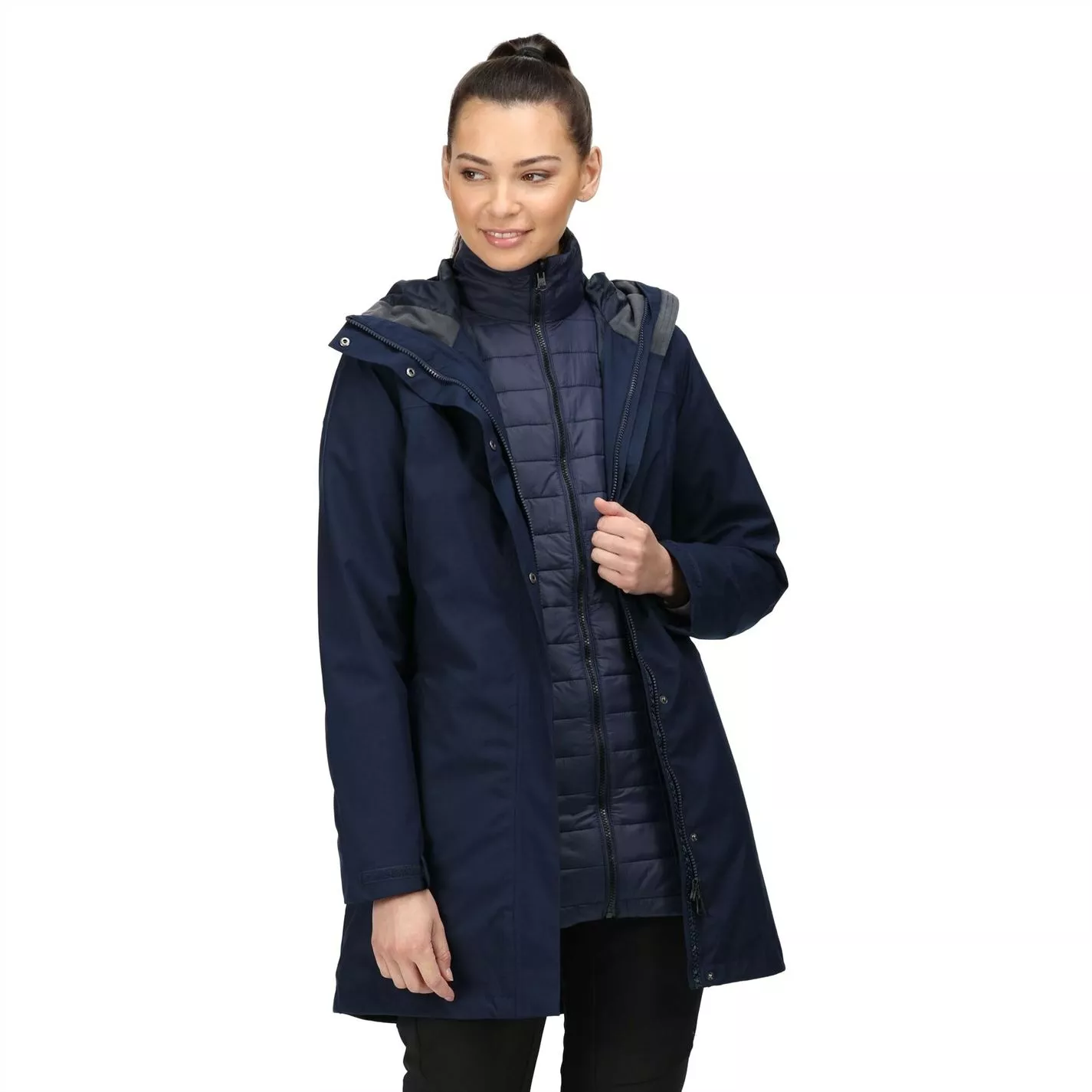 Regatta’s Women’s Denbury II jacket for adventure seekers. The 3-in-1 women’s jacket is made from waterproof and breathable fabric for winter weather protection. Take off the outer layer to reveal a warming padded jacket, packed with style.