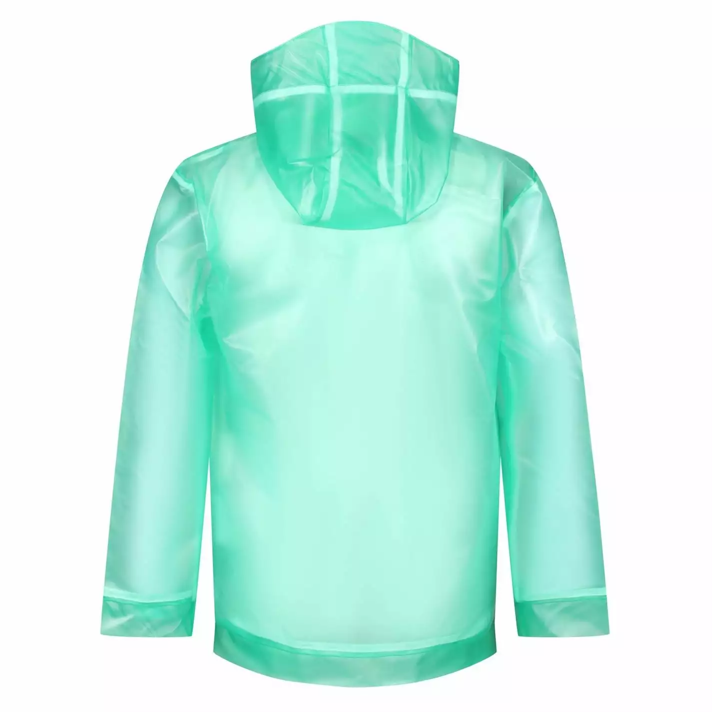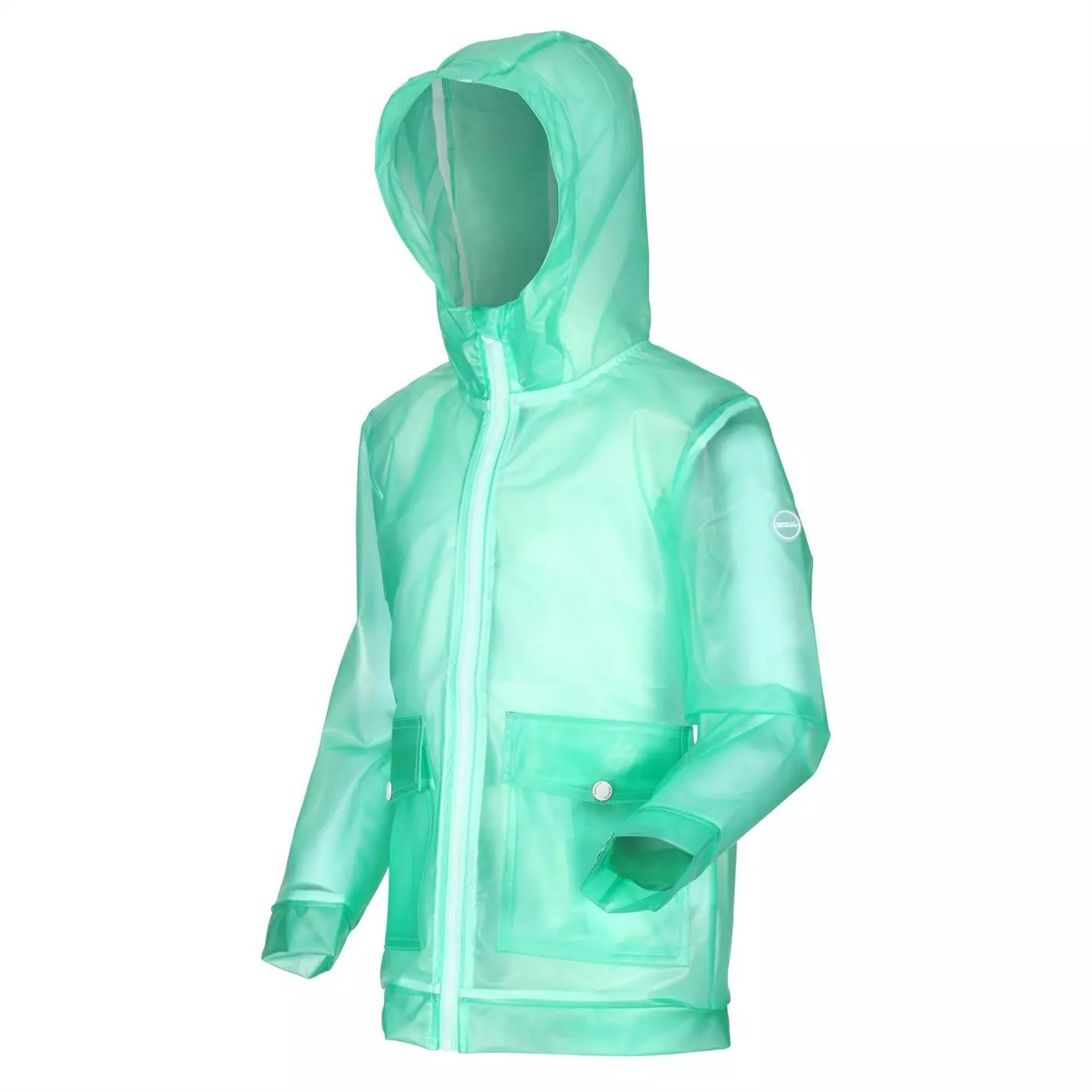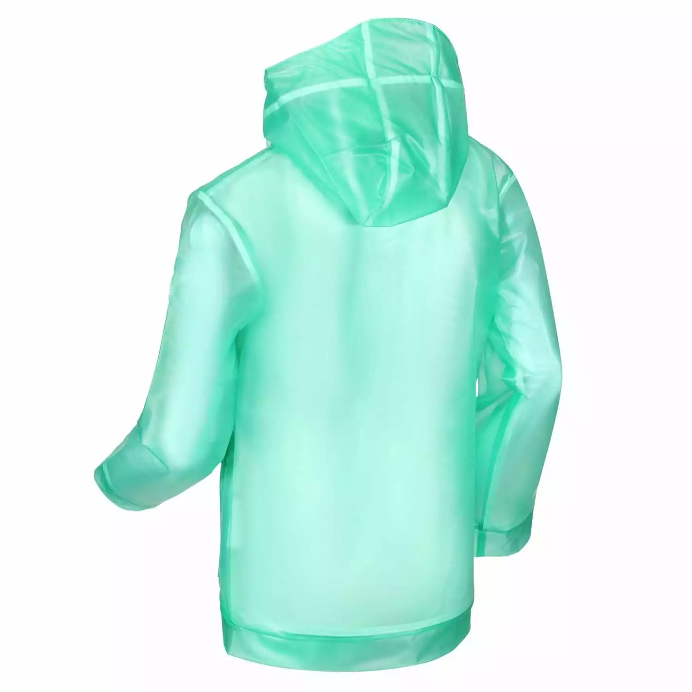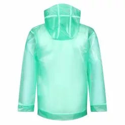 The kids’ Hallow Jacket from Regatta is made from coloured transparent fabric with a moisture-shedding DWR (Durable Water Repellent) finish. Cut with a deep funnel neck and hood and the Regatta Outdoors badge on the left sleeve.