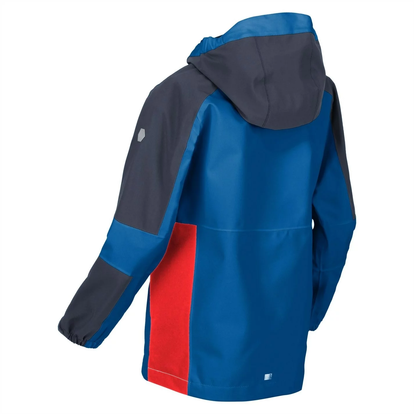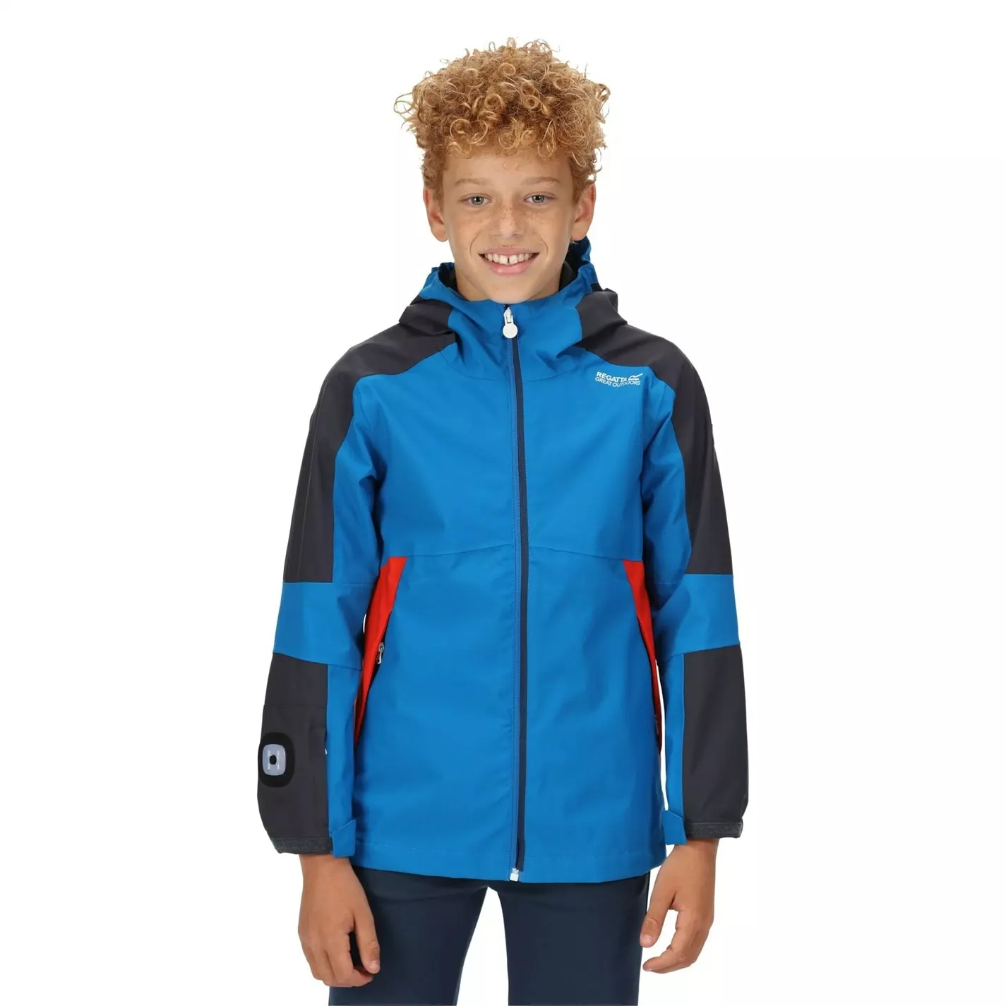 The Raiz kids’ Brite Light waterproof & breathable torch technology jacket from Regatta, is perfect for little adventurers. The kids’ hiking jacket is made with waterproof & breathable stretch Isotex recycled fabric, making it ideal for outdoor pursuits in unpredictable weather. With Brite Light sleeve torch technology with 3 brightness settings for exploring in the dark. With a built-in rechargeable battery, grown on hood and reflective trim.
