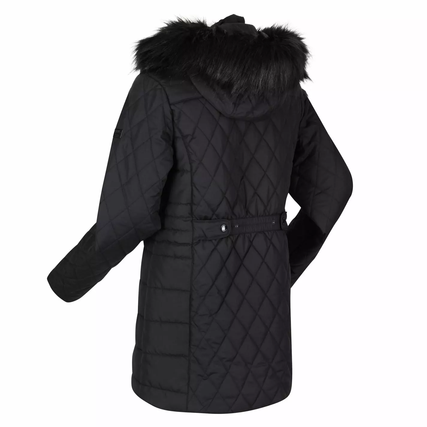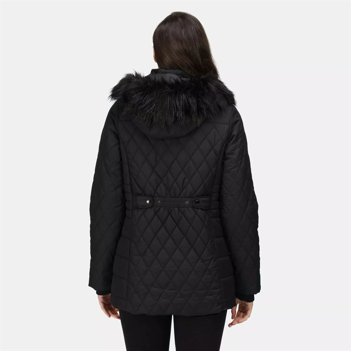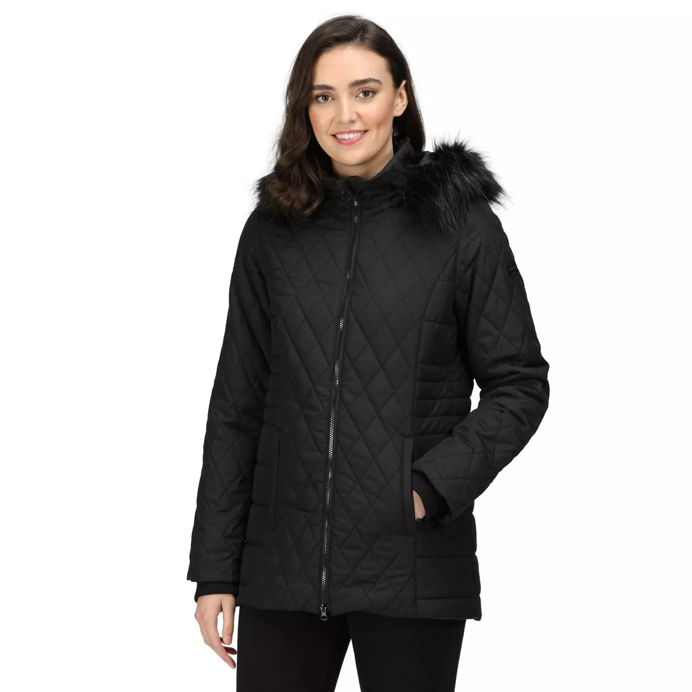 The Zalika jacket from Regatta. Head on the winter commute in style. This women’s winter jacket comes with a water-repellent coating and a diamond quilt front for a stylish edge. The elasticated belt provides a flattering fit.