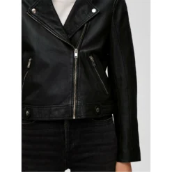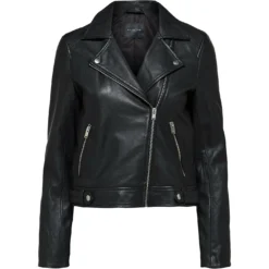 With a biker inspired design, the selected Femme Katie Leather Jacket is a perfect everyday staple for a chic and contemporary style. Crafted from a soft lamb leather with a staple black colourway, this slight cropped silhouette features a front zip fastening with notched lapel collar, zip cuffs to the long sleeves and double zipped pockets perfect to store your essential items.