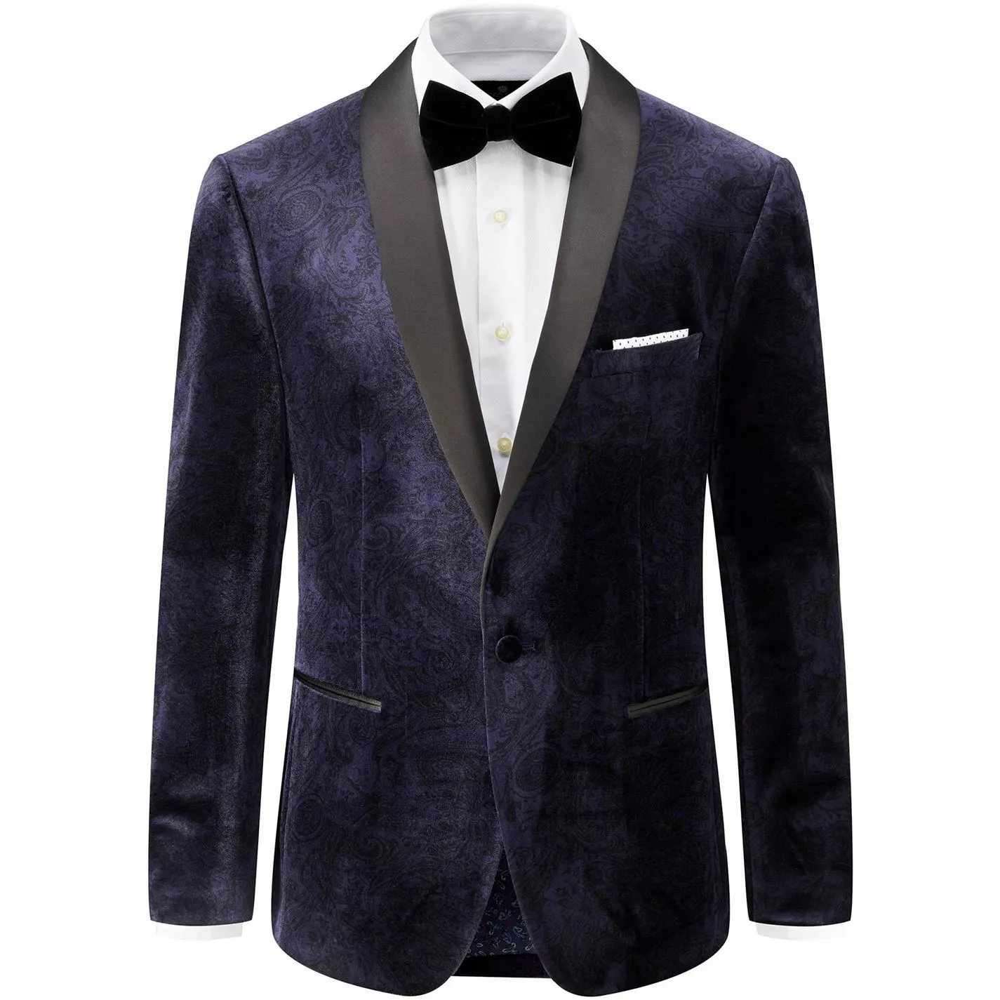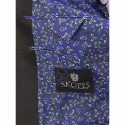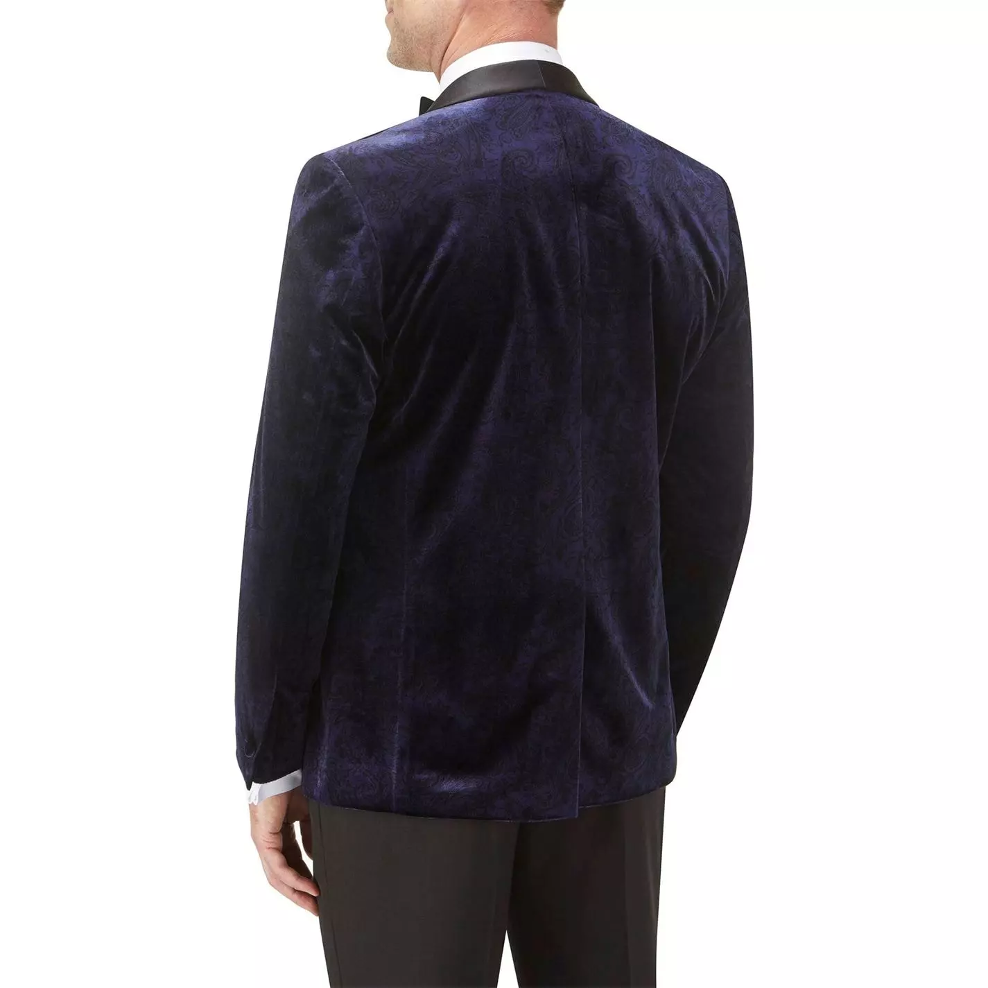 Skopes Garrix Jacket with Shawl Collar. Show off your impressive style credentials with this navy paisley design fabric tailored fit jacket. Party season full ahead! Features include single breasted one button fastening, satin shawl collar, jetted satin waist pockets, contrast pattern lining, cloth covered buttons and centre back vent.