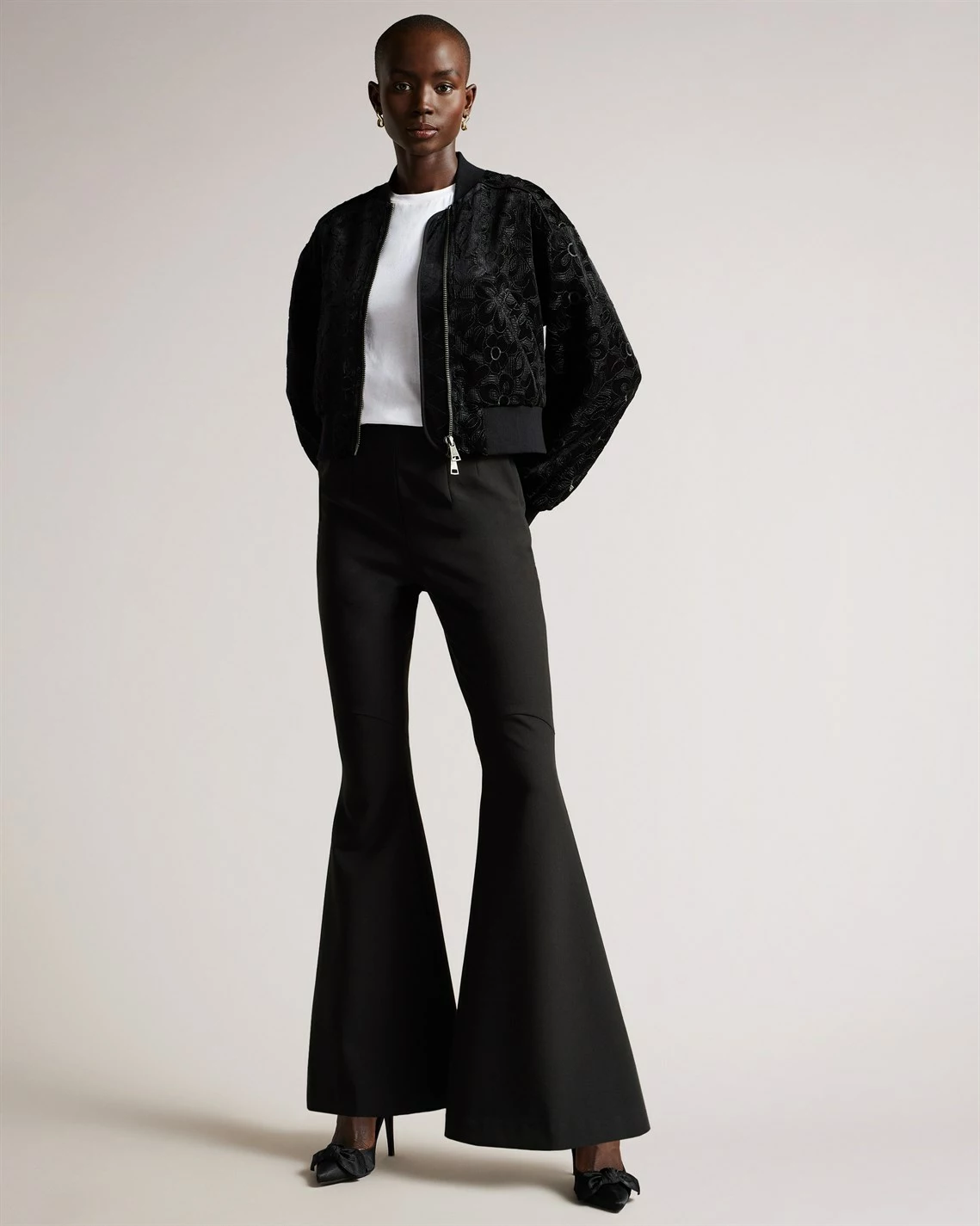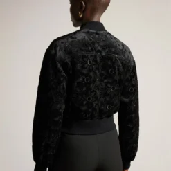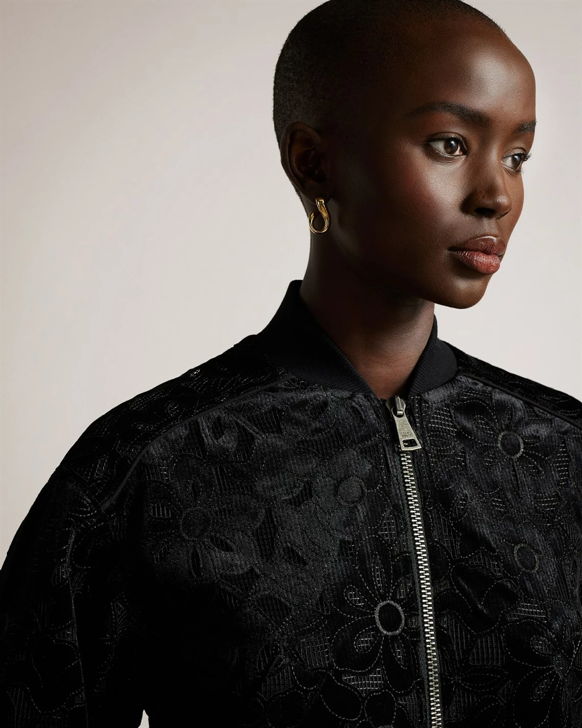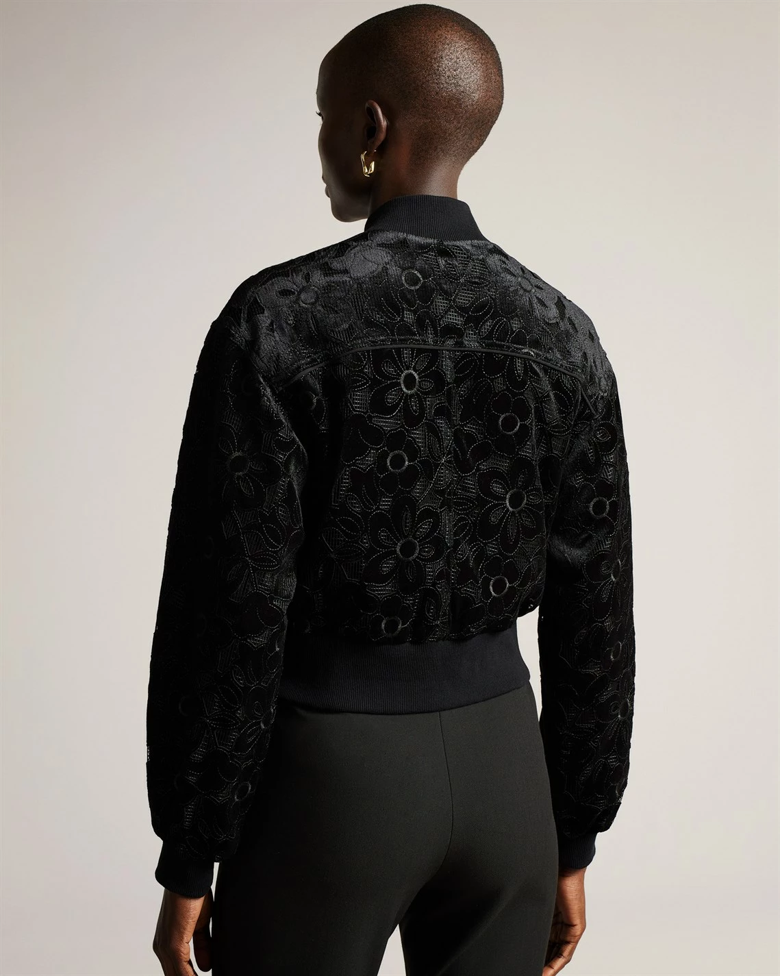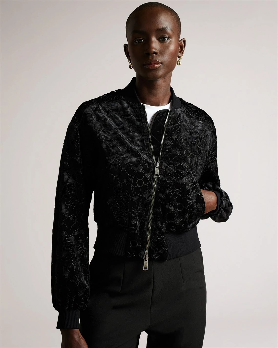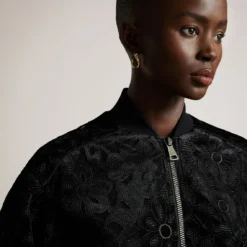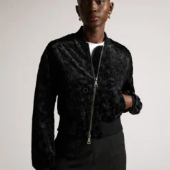 The versatile Zariya Bomber Jacket from Ted Baker is the essential day-to-knight piece your wardrobe needs. Adroitly crafted in a polyester velvet fabrication, this jacket is cropped for a modern style and features a stand neck, long sleeves, open slash pockets, ribbed cuffs and trims for comfort, a central two way zip fastening and a straight hem. Decorated in a solid colour throughout, the design is finished with an all over velvet floral motif. Shell / Embroidery / Lining: 100% polyester. Applique: 92% polyester, 8% elastane. Rib: 97% cotton, 3% elastane. Cool Hand Wash Only.