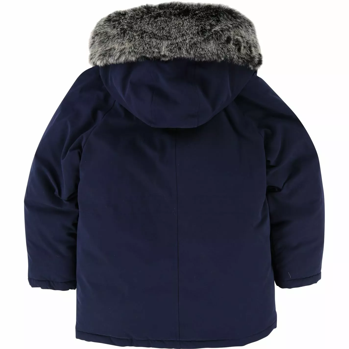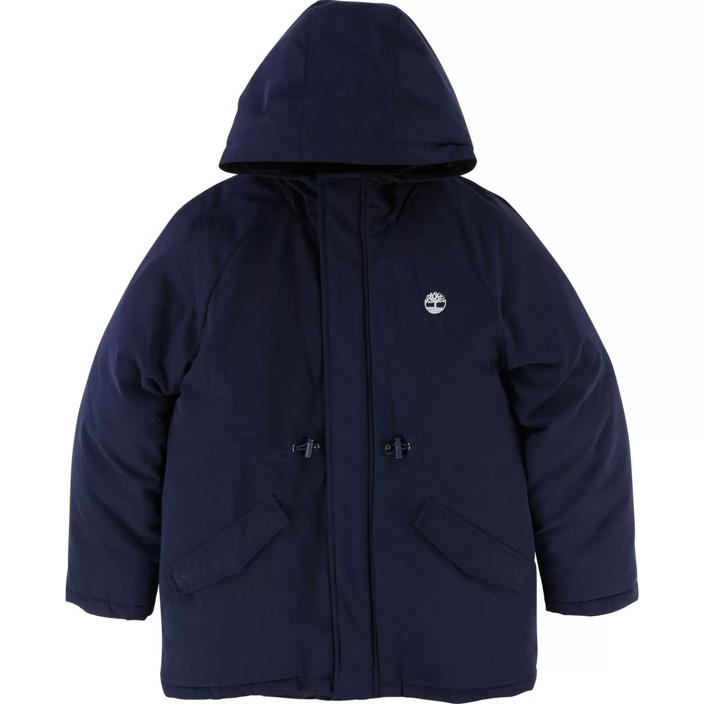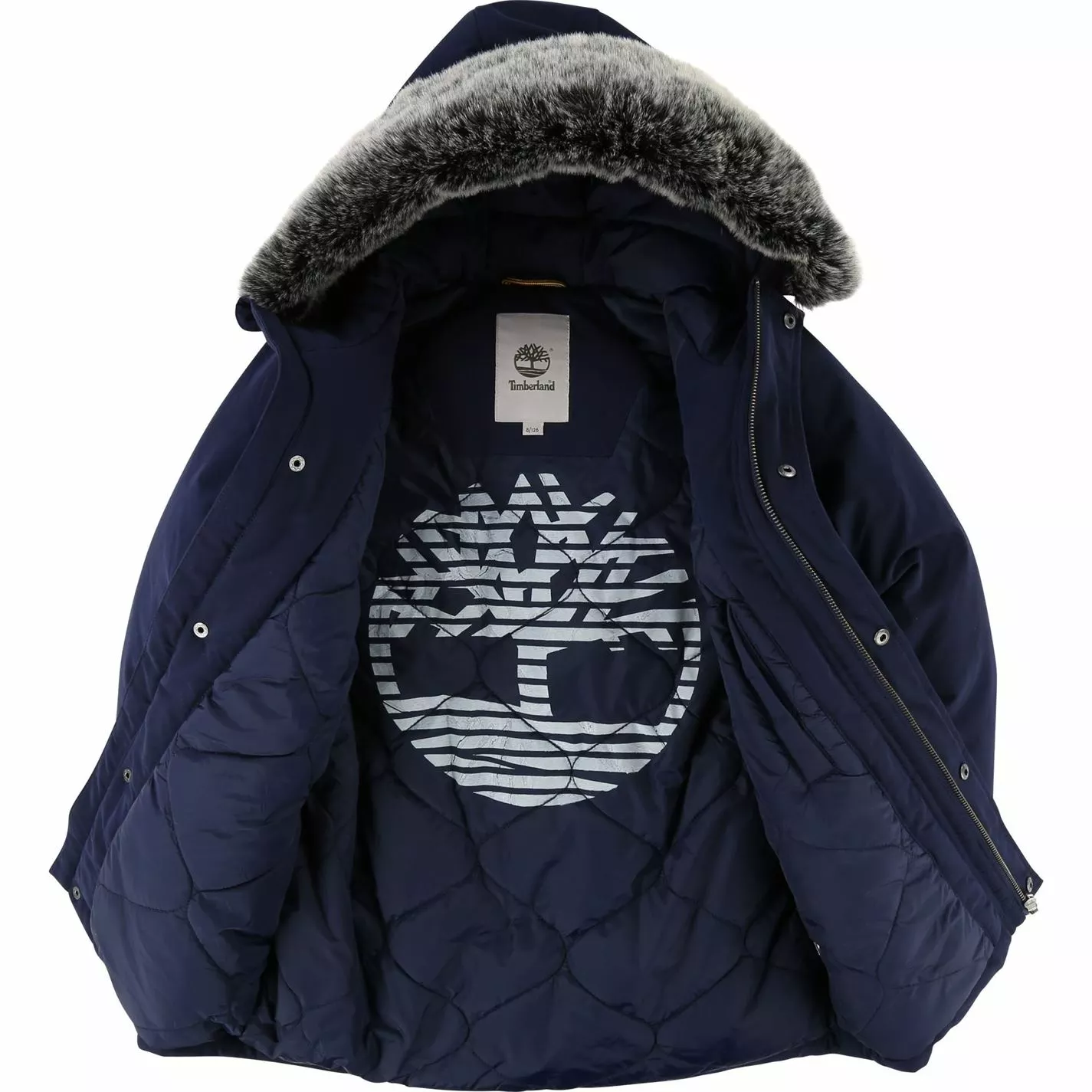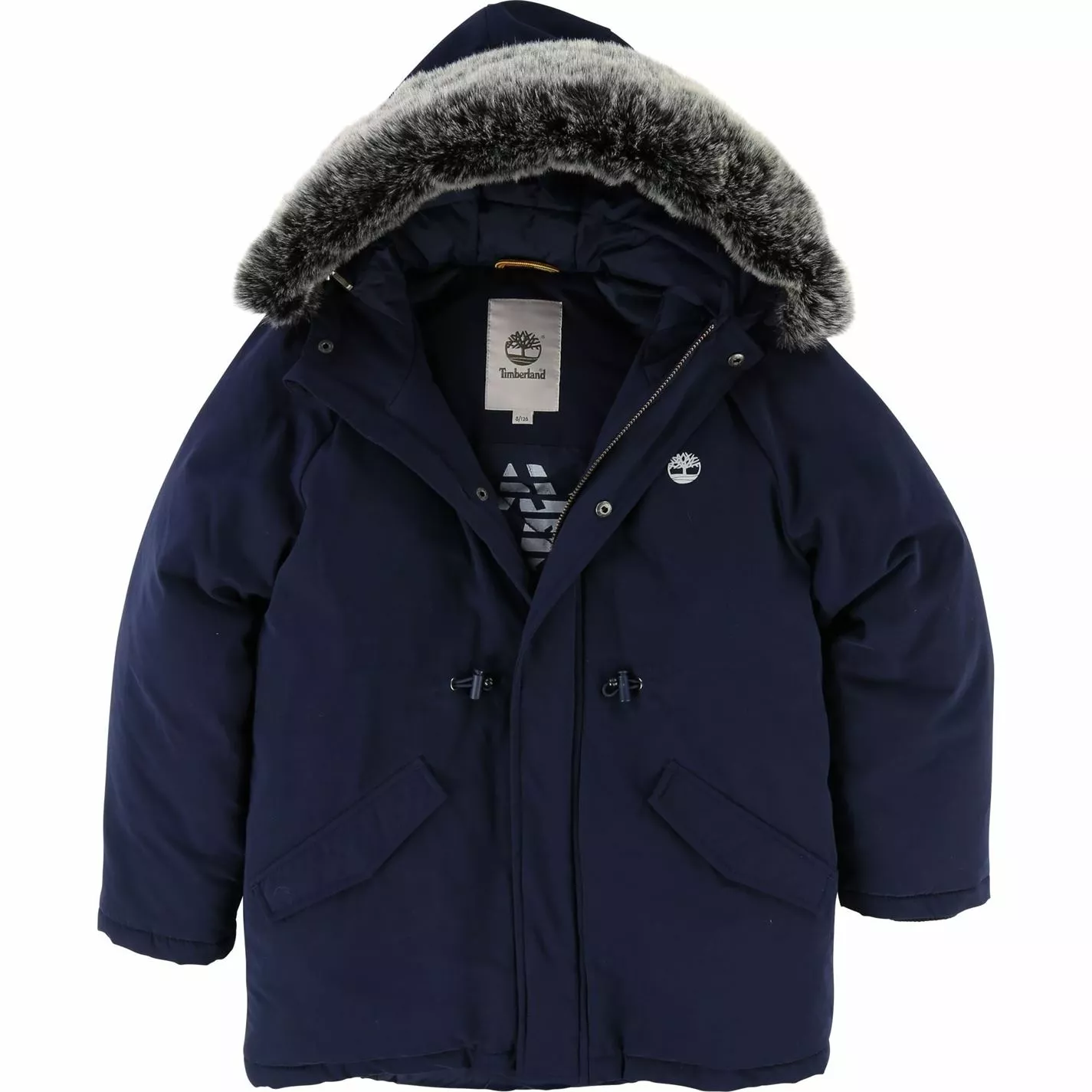 Water-repellent polyester twill hooded parka, nylon lining, cotton-wool padding, removable fake fur, Yellow Boot lace + Timberland logo.