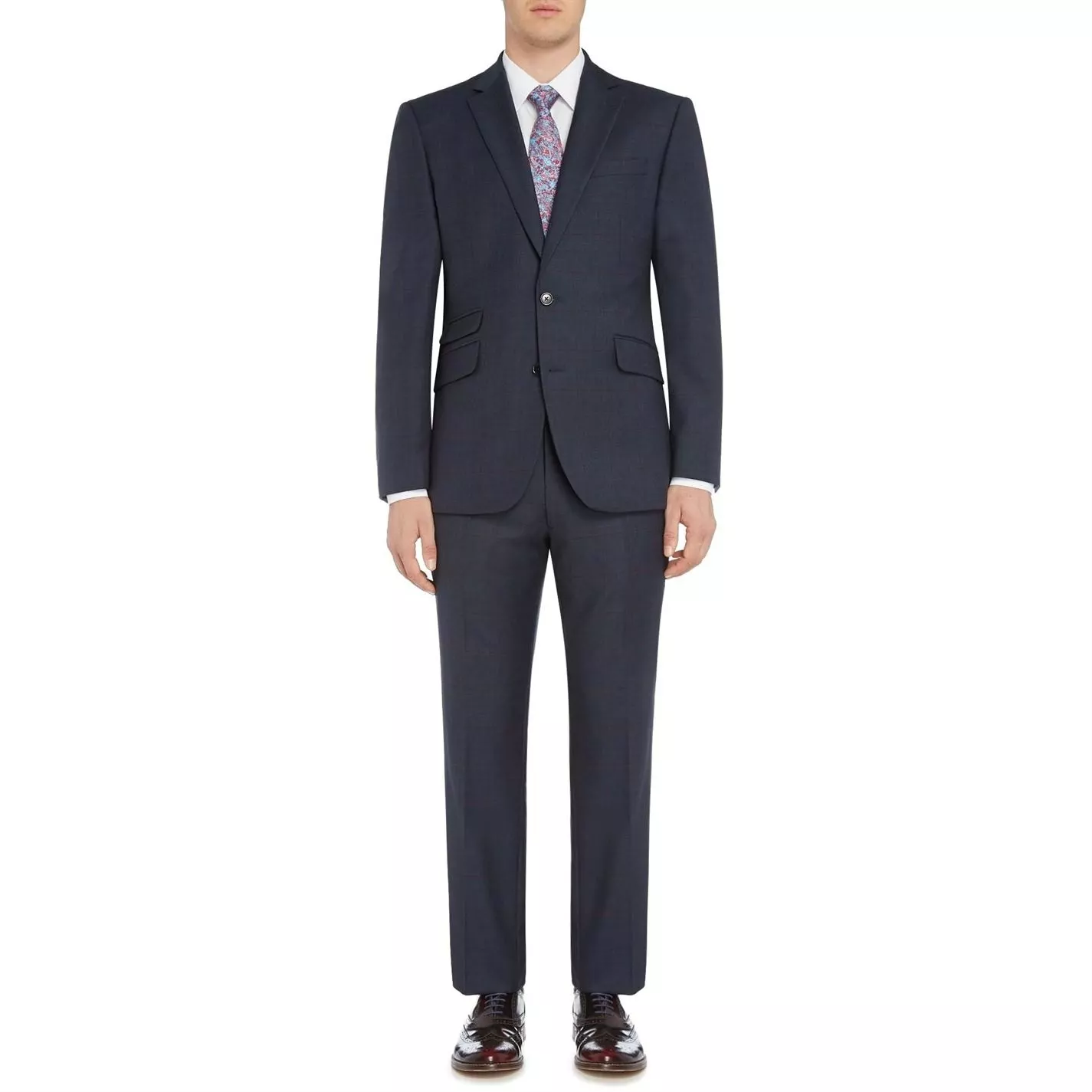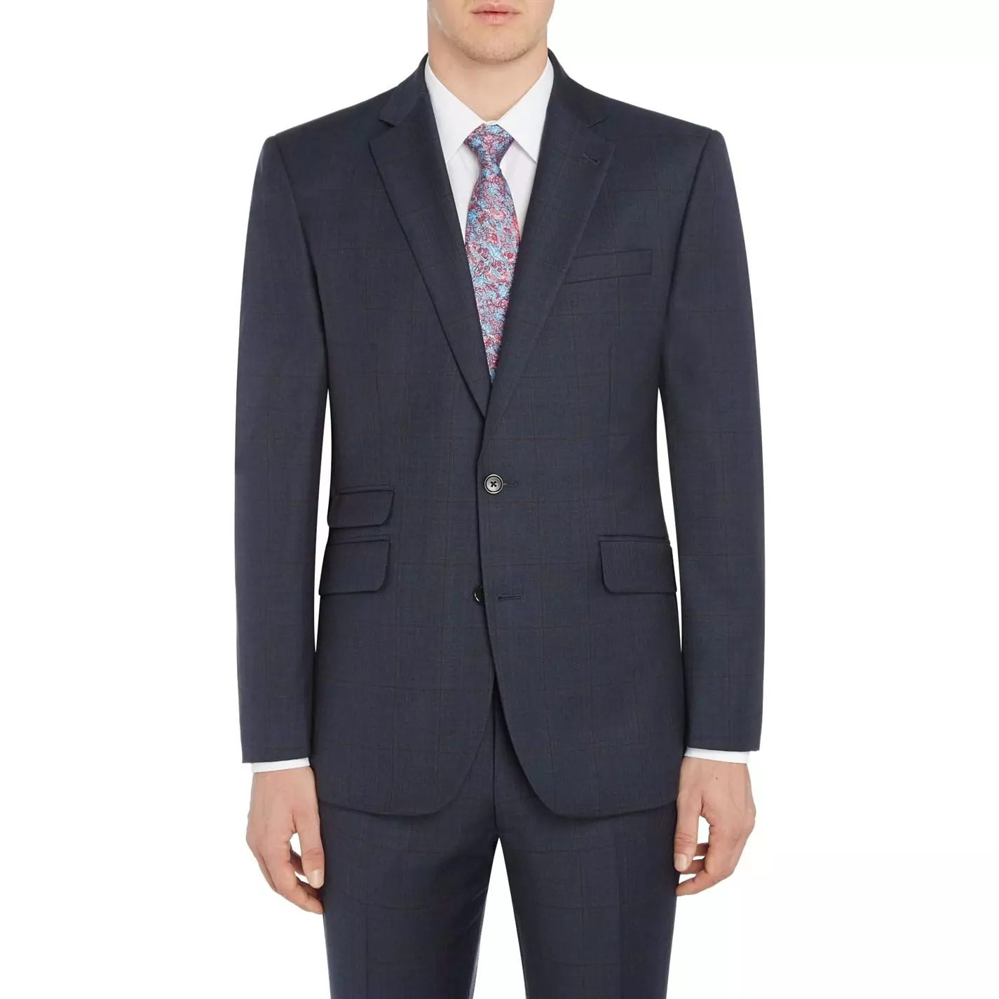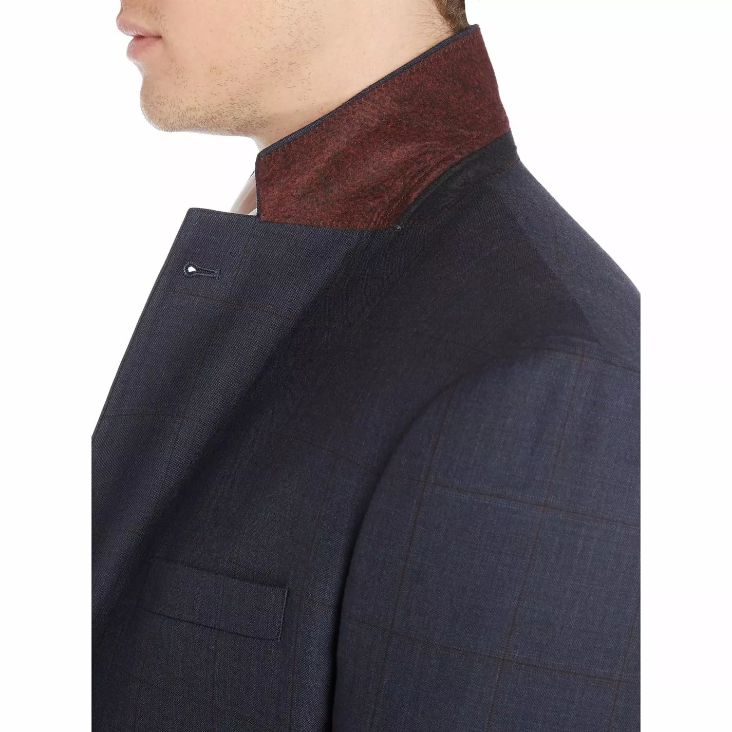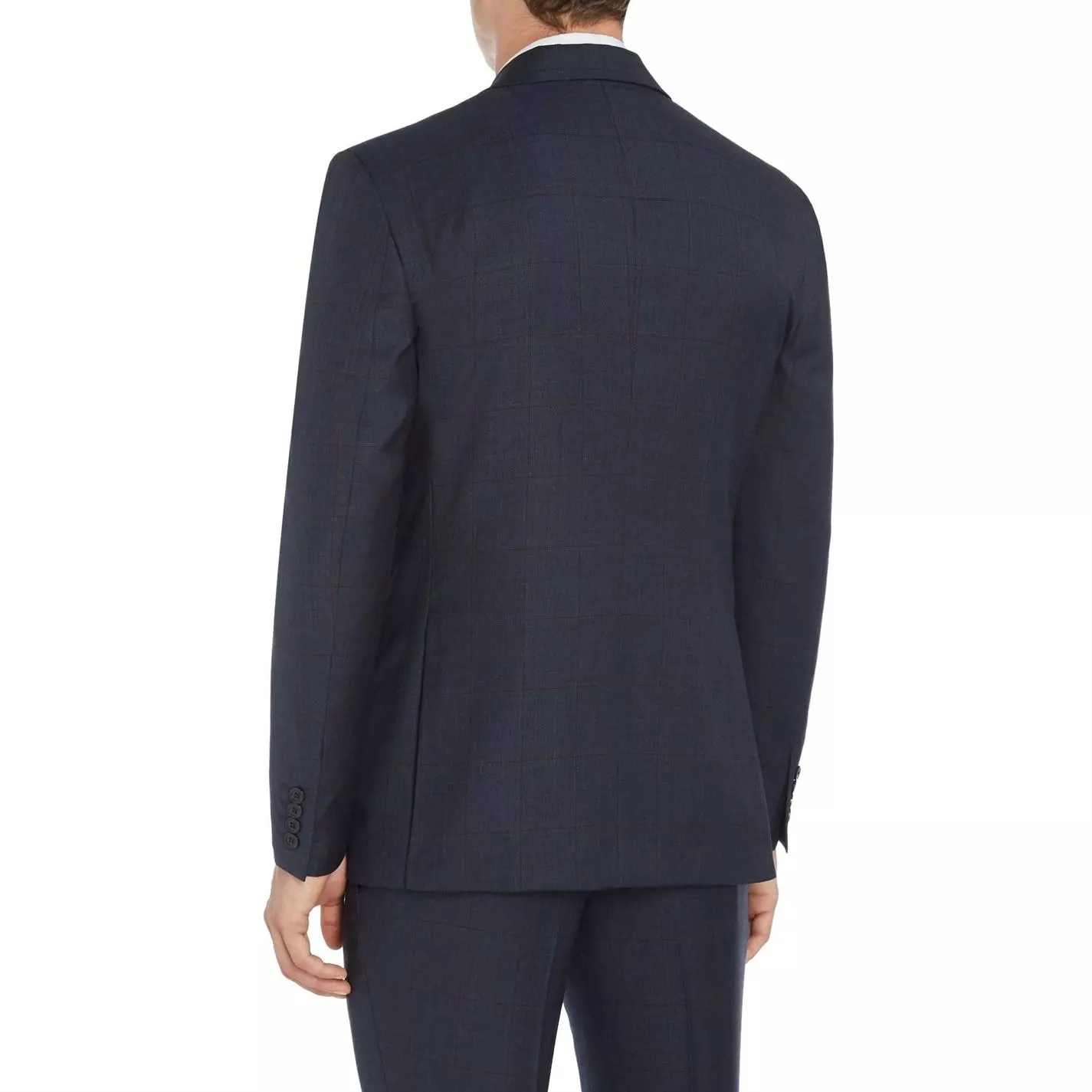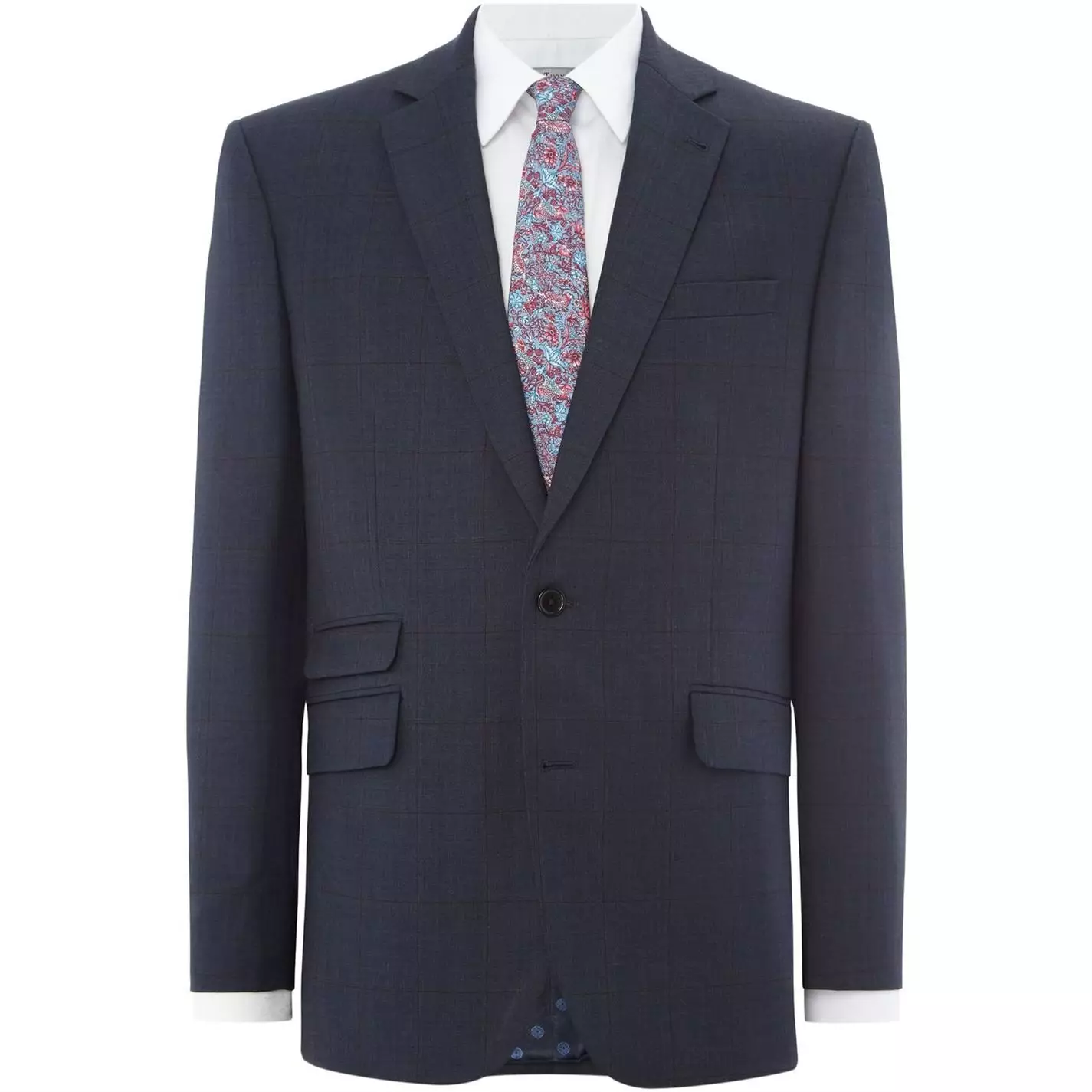This subtly checkered Devonshire suit jacket by Turner & Sanderson will make a handsome addition to your formal wardrobe. Crafted from a premium wool blend, and generously cut in a tailored fit, this full lining suit features a soft check pattern which is complemented by the contrasting undercollar for an added dash of flair. It comes with elegant notch lapels, flap side pockets, a welt breast pocket and double vents for freedom of movement. Create a distinctly polished look with the matching Devonshire check suit trouser, a fitted shirt and a silk patterned tie.