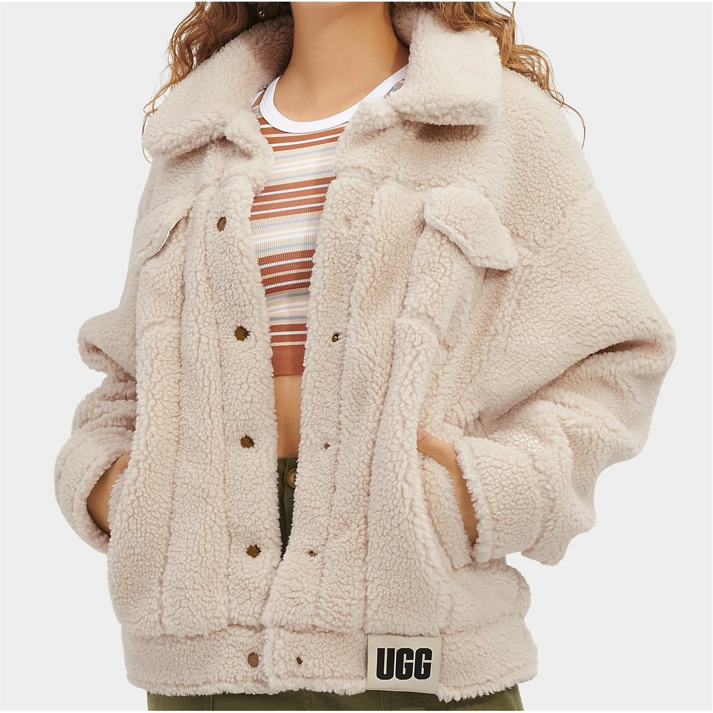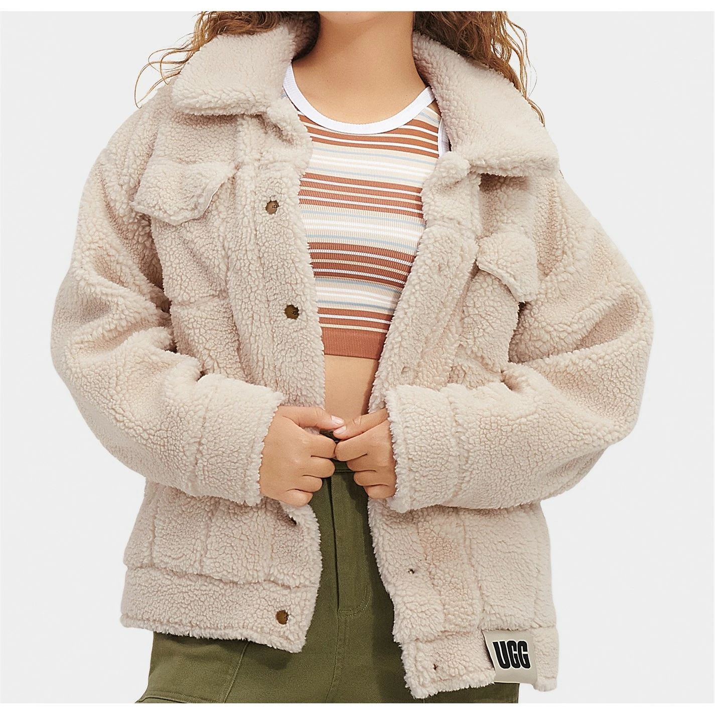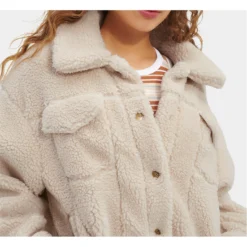 Update your collection with this UGG Frankie Sherpa Jacket. Crafted with a fold over collar and full button fastening for a secure fit, it features long sleeves and four pockets for a classic look. This jacket is designed wiht a signature logo and is complete with UGG branding.