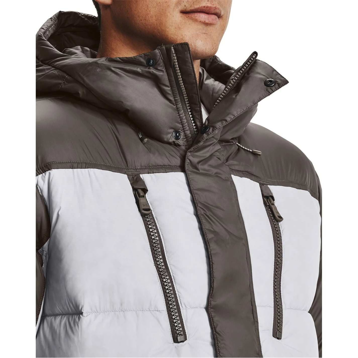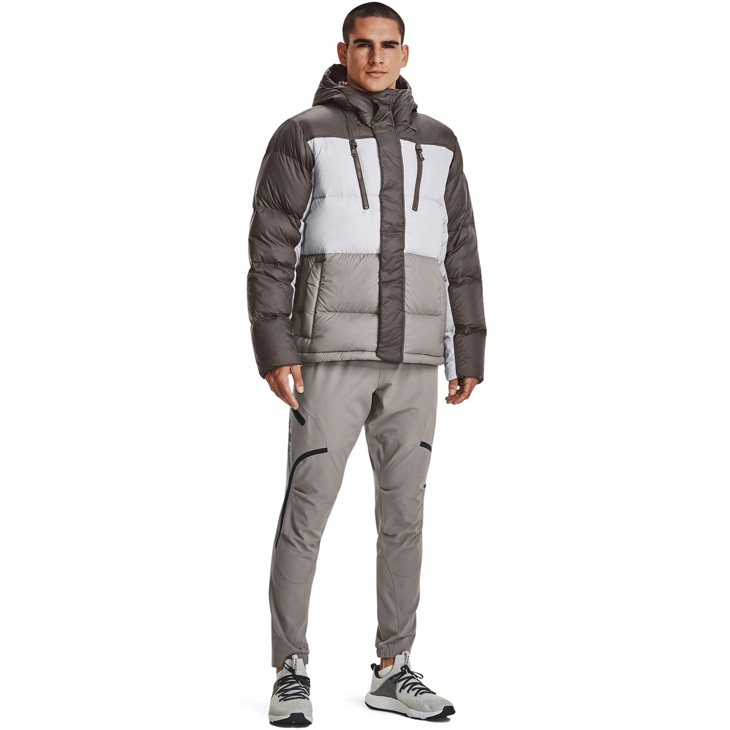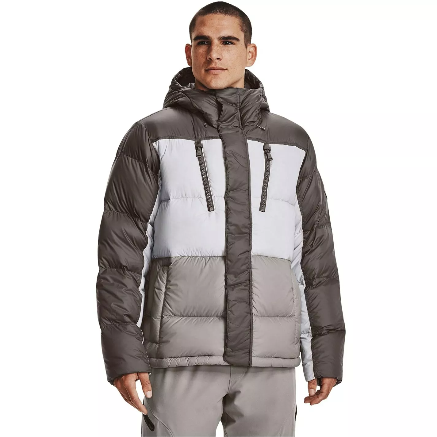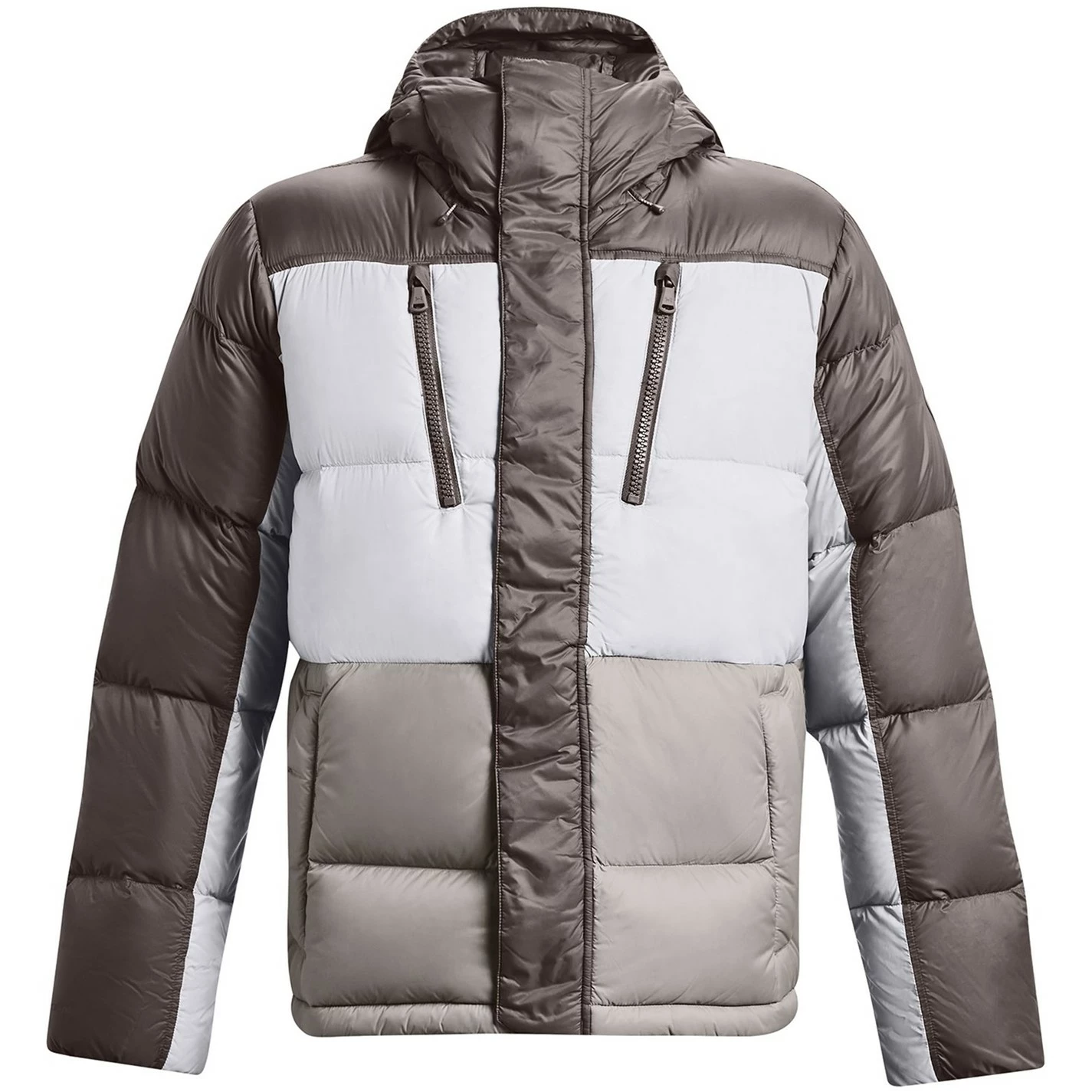 This Under Armour CGI Down Jacket is crafted with full zip fastening and long sleeves for a secure fit. It features a hooded neckline and four pockets for a classic look. This jacket is a colour block design with a signature logo and is complete with Under Armour branding.