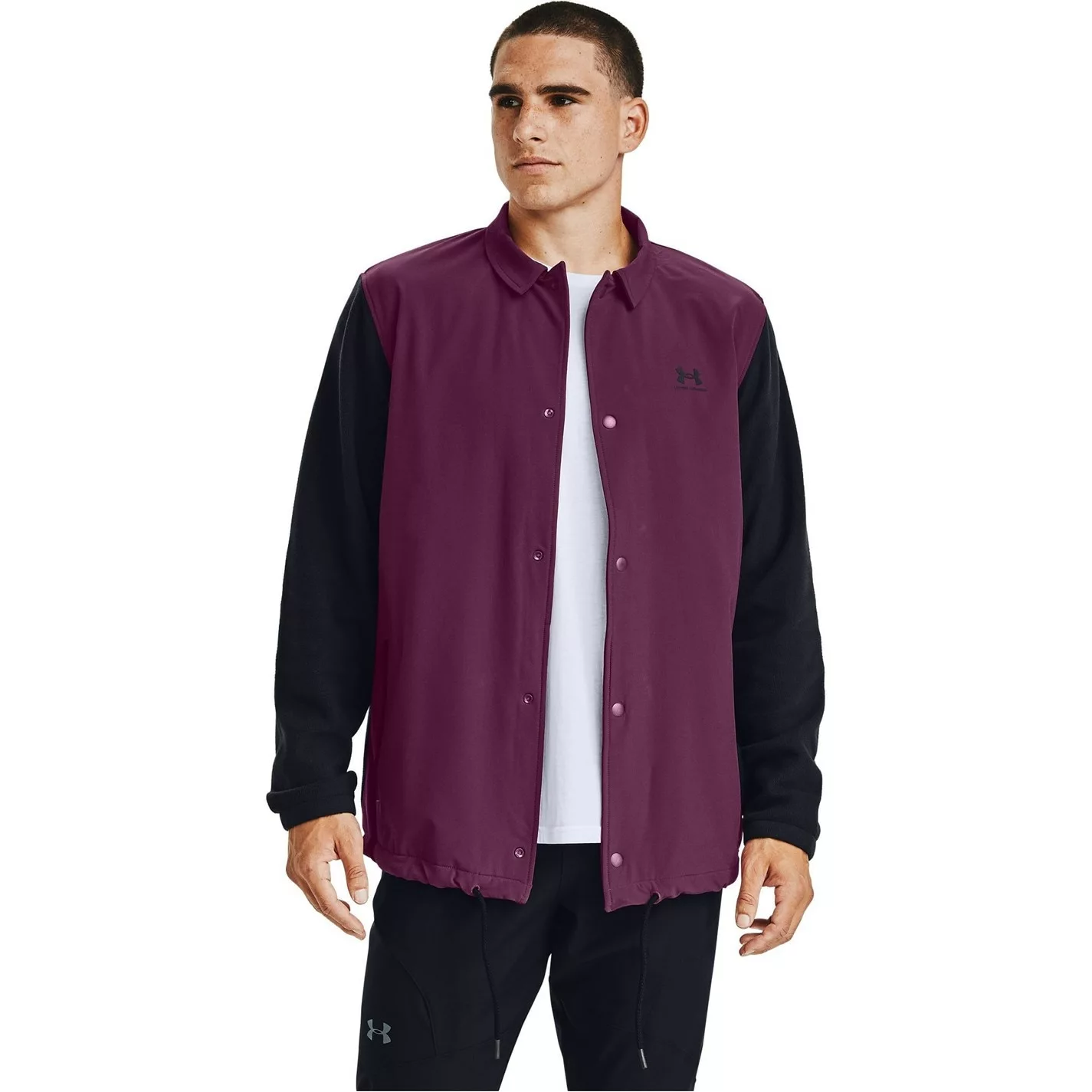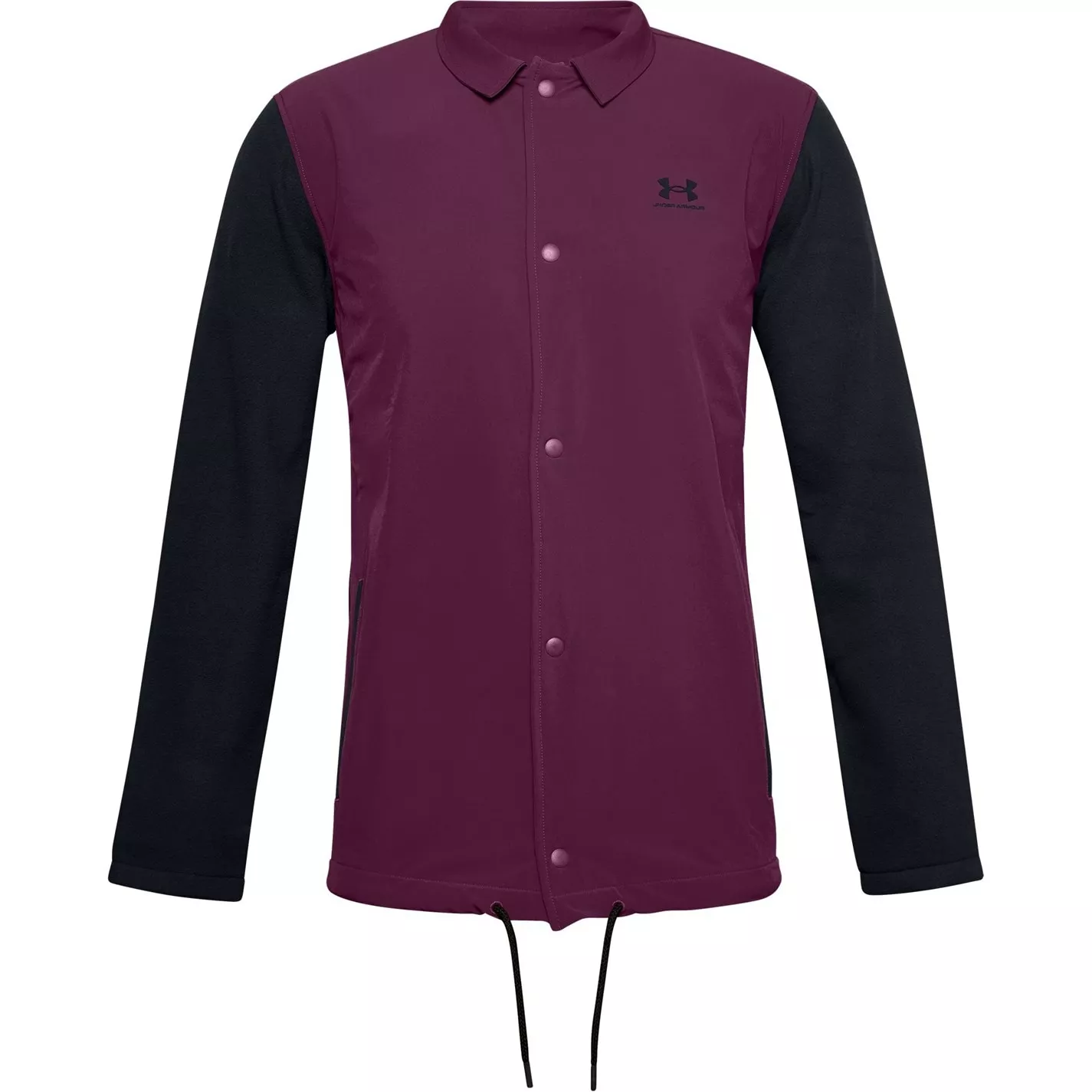 This Under Armour Coaches Jacket is crafted with a folded collar, full button fastening and a drawstring adjustment to the bottom hem for a secure fit. It features long sleeves plus two hand pockets for a classic look and is a lightweight construction. This jacket is a colour block design with a signature logo and is complete with Under Armour branding.