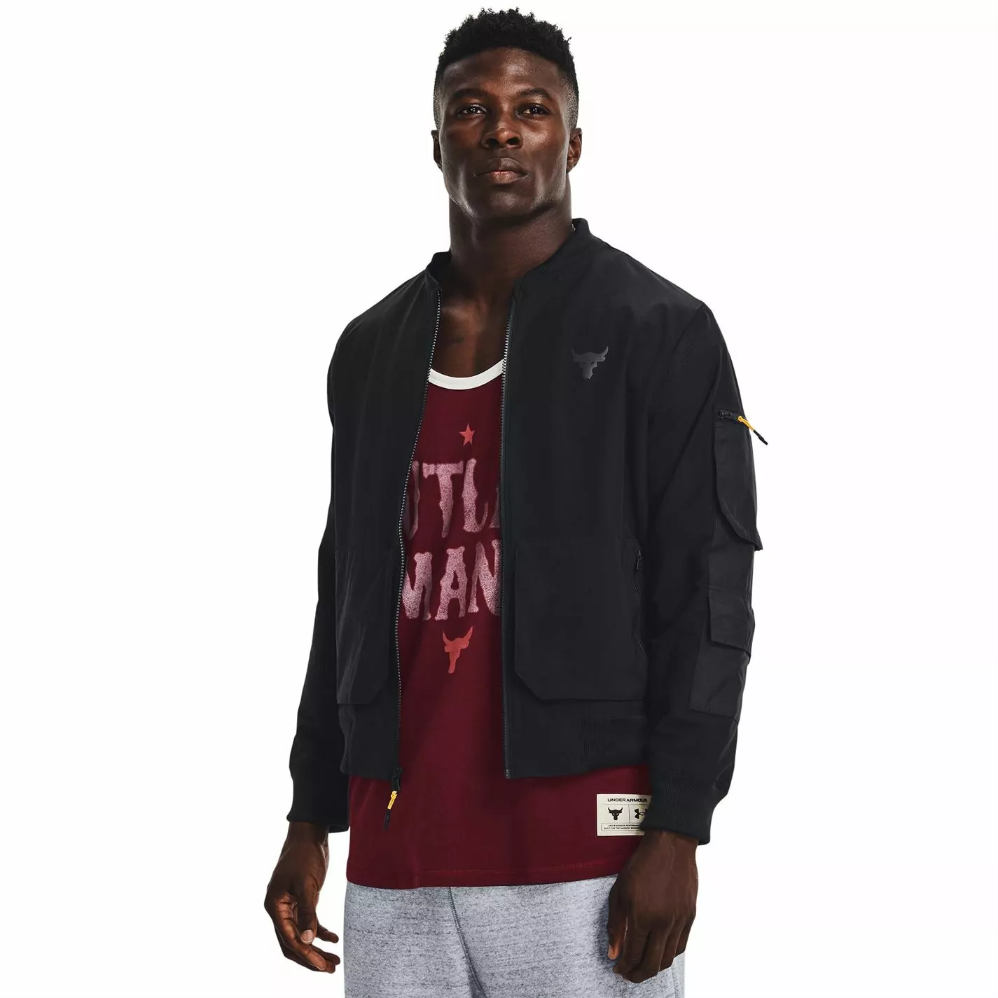 This Bomber Jacket has been developed in collaboration with Dwayne Johnson and Under Armour and benefits from being developed with UA Storm technology which will keep you dry in wet conditions, while the two side pockets is assisted further by a zipped pocket on the sleeve to ensure you have all the storage space needed for your essentials and the iconic bull logo celebrates the collaboration with The Rock.