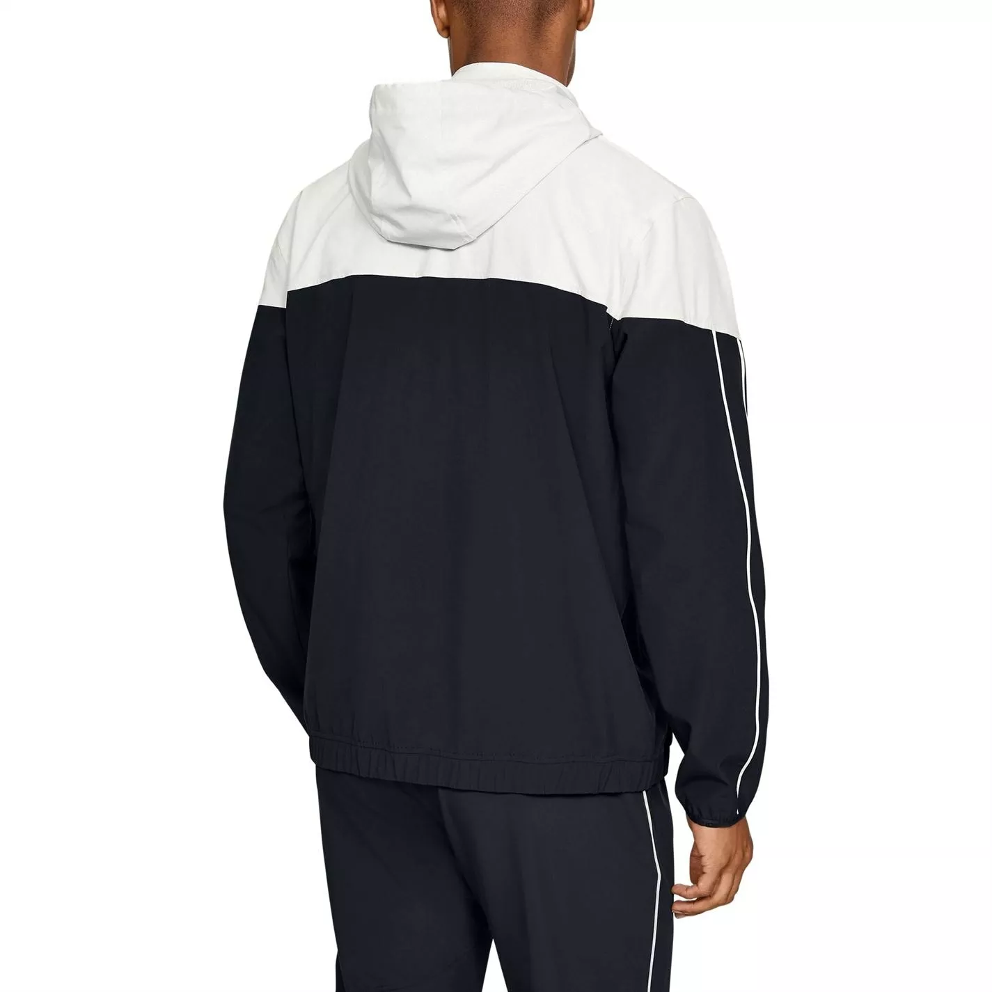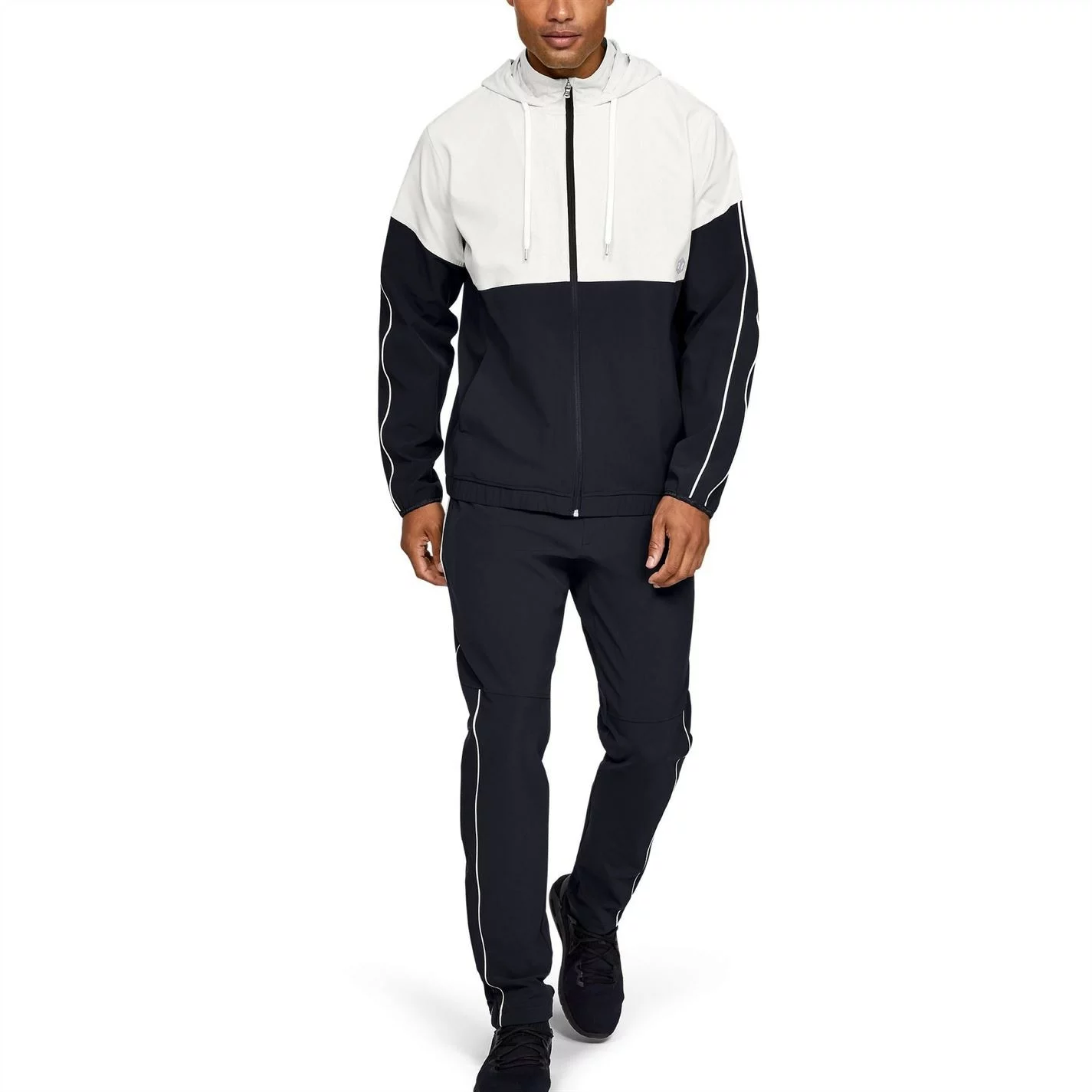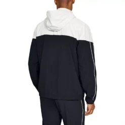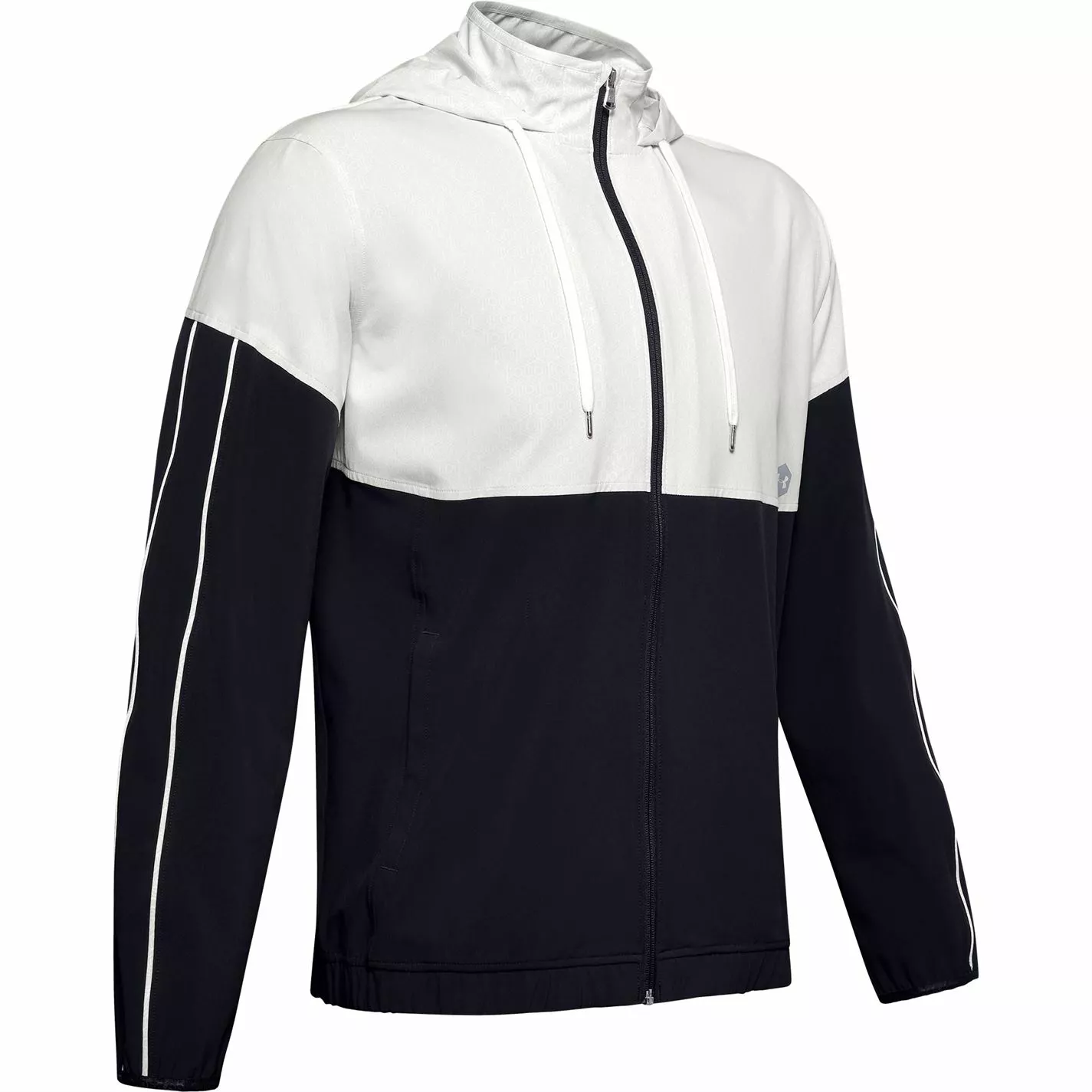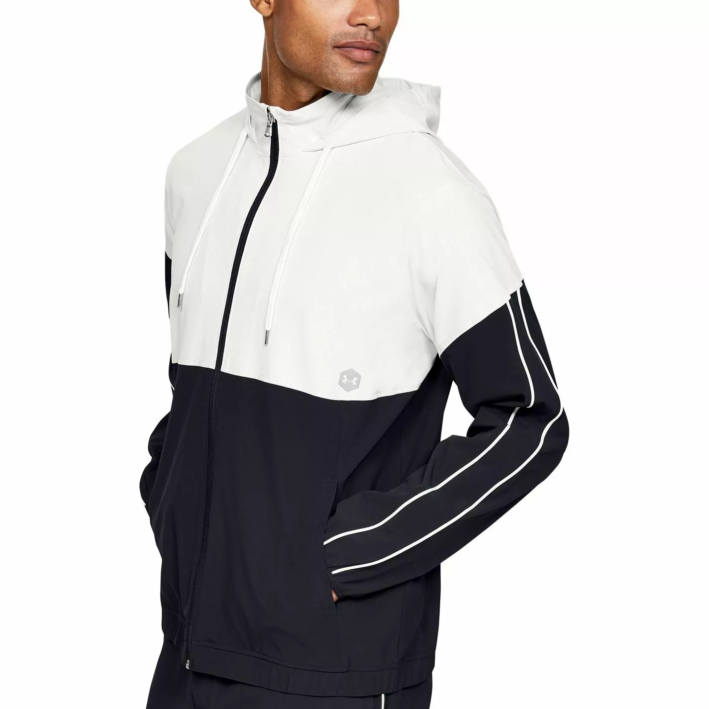 Layer up this season wearing this Under Armour Recover Warm Up Jacket. Constructed from a lightweight fabrication, this jacket is crafted with a central zip fastening leading to a drawstring hood, long sleeves and elasticated trims for a variable fit. Boasting two pockets to the front for carrying essentials, this jacket is styled in a colour-block design and is complete with the Under Armour logo for brand recognition.