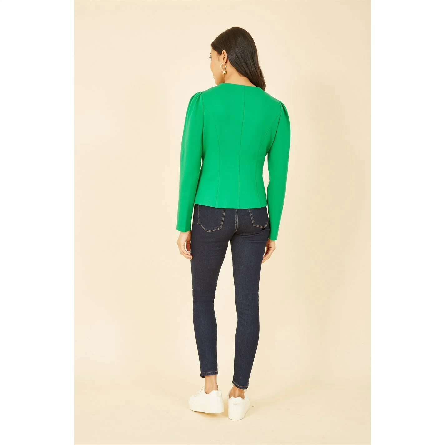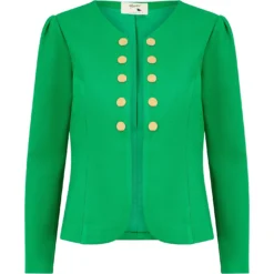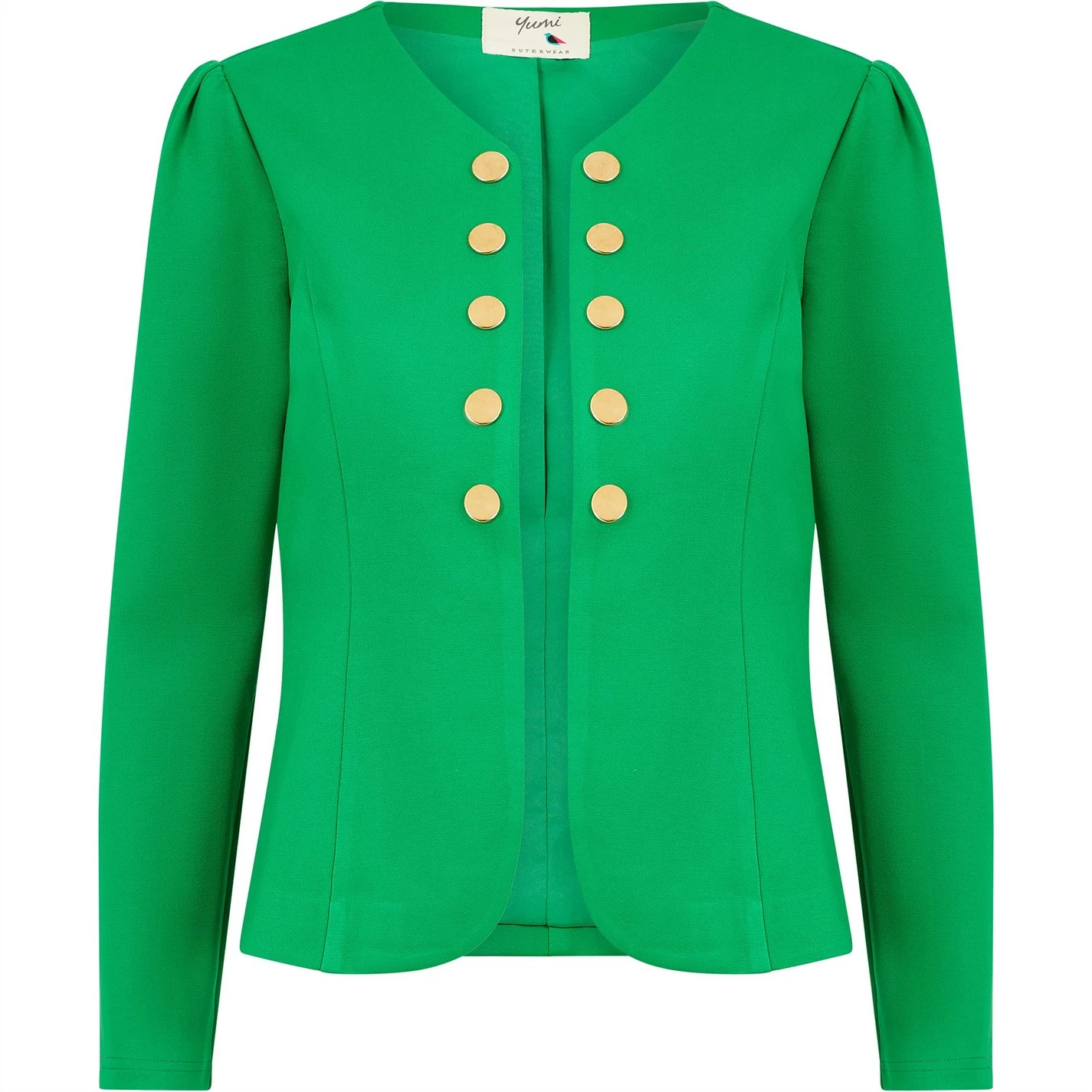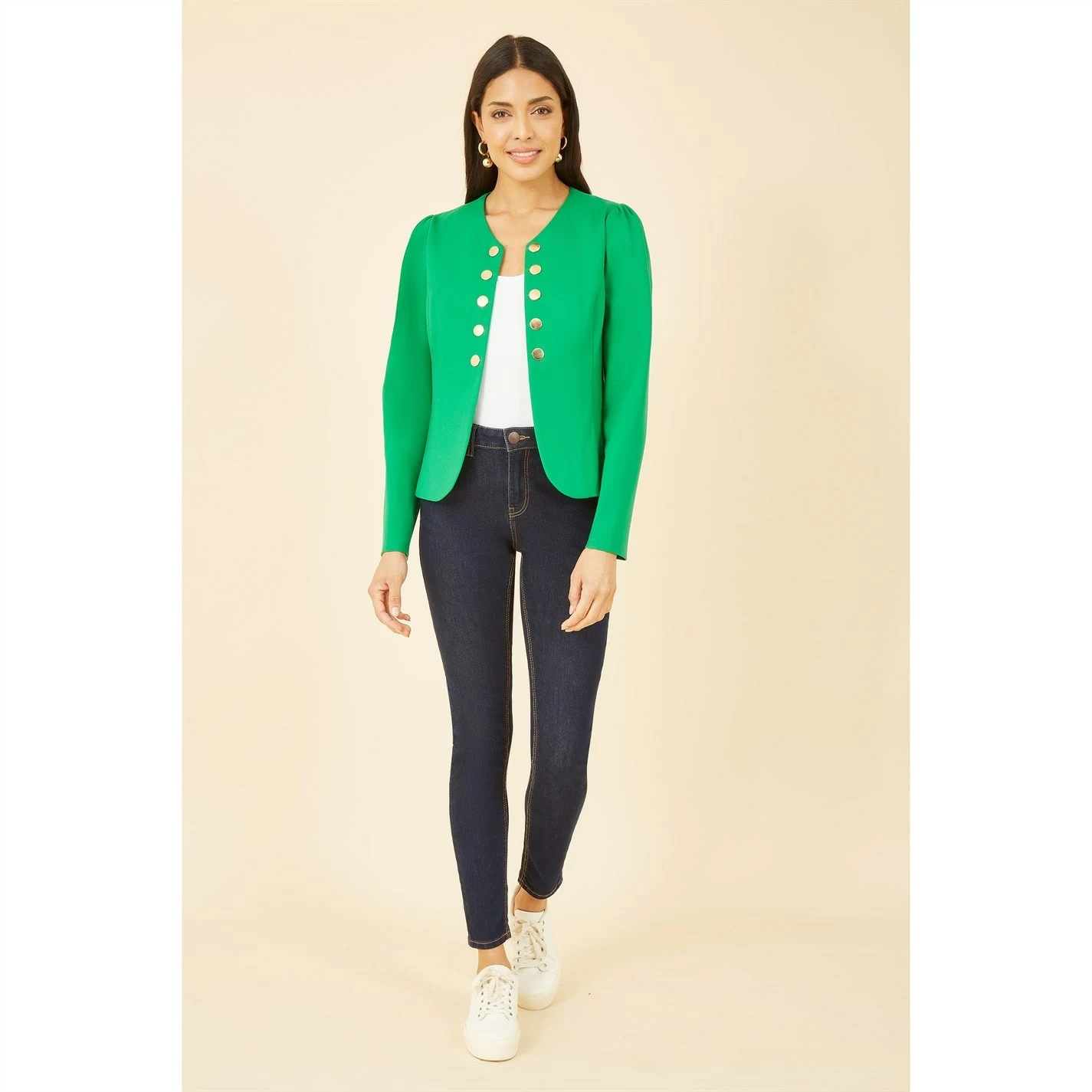 This Yumi green blazer will add a pop of colour to your wardrobe, whilst maintaining a smart and sophisticated look. The slim fitting jacket has an edge to edge design, with military style buttons on the lapel. Made with a small amount of stretch to add ease of movement to the wearer.