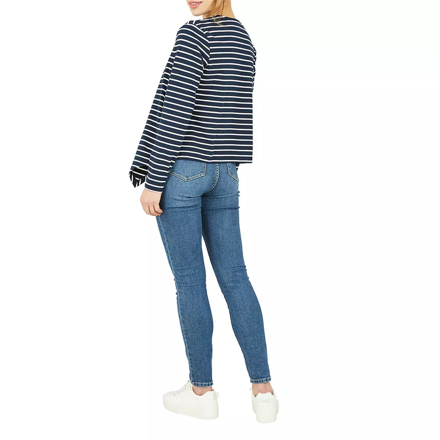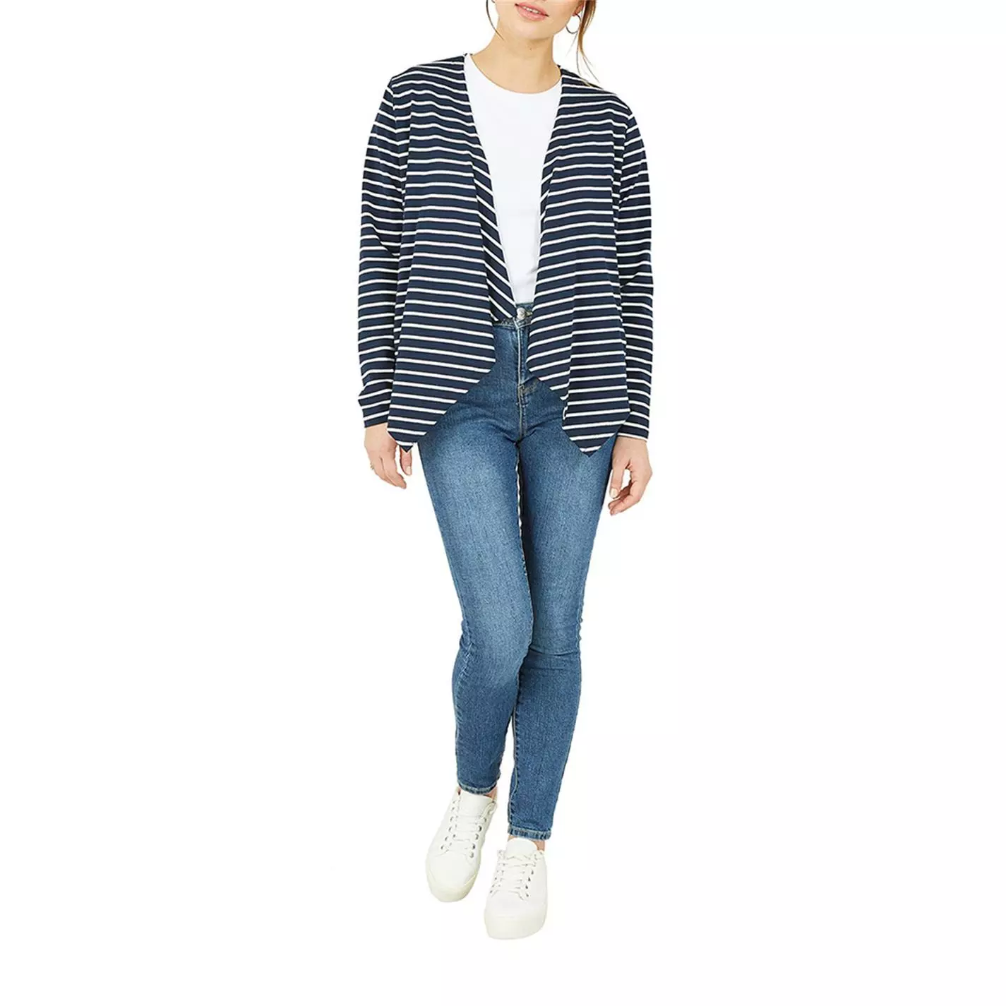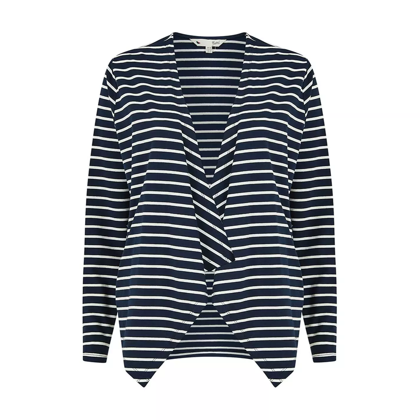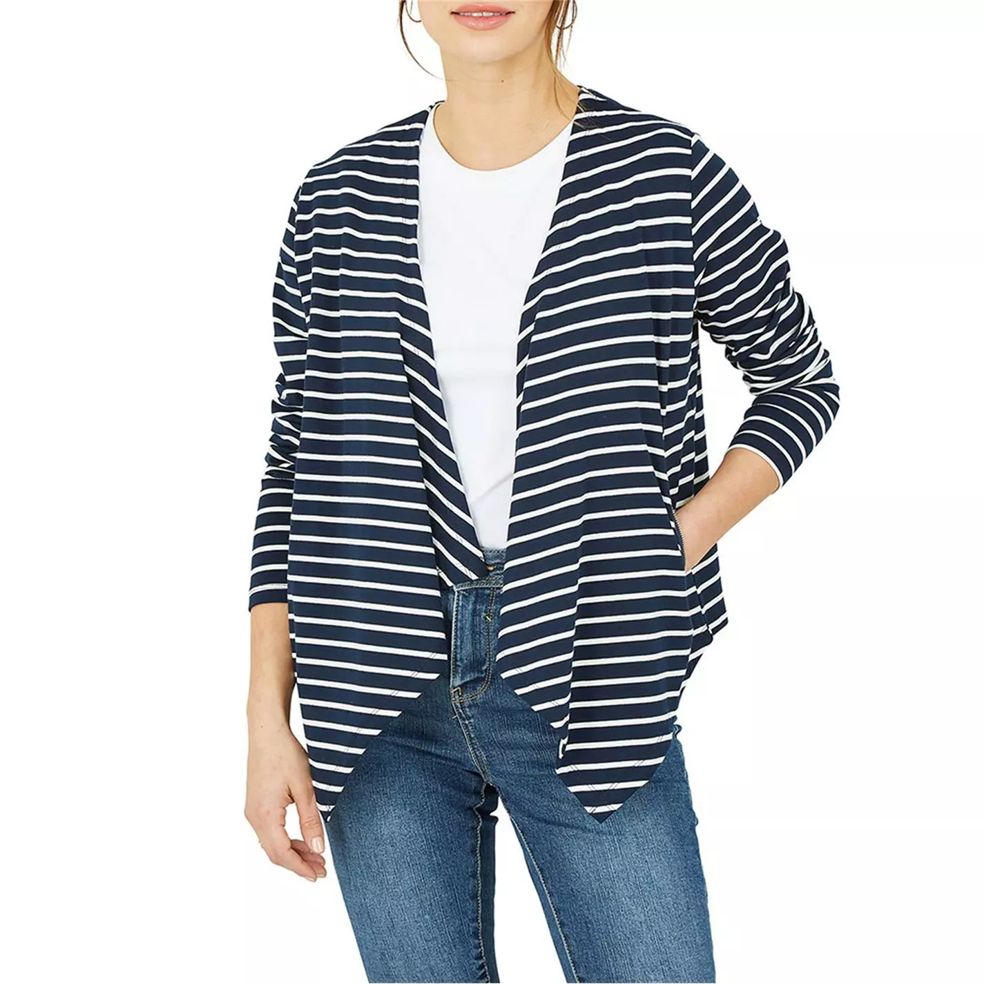 Upgrade your outerwear with this light jacket. The perfect nod to nautical in Navy and white stripes. Designed with soft and stretchy jersey, this piece features a waterfall front, zip pockets and long sleeves.