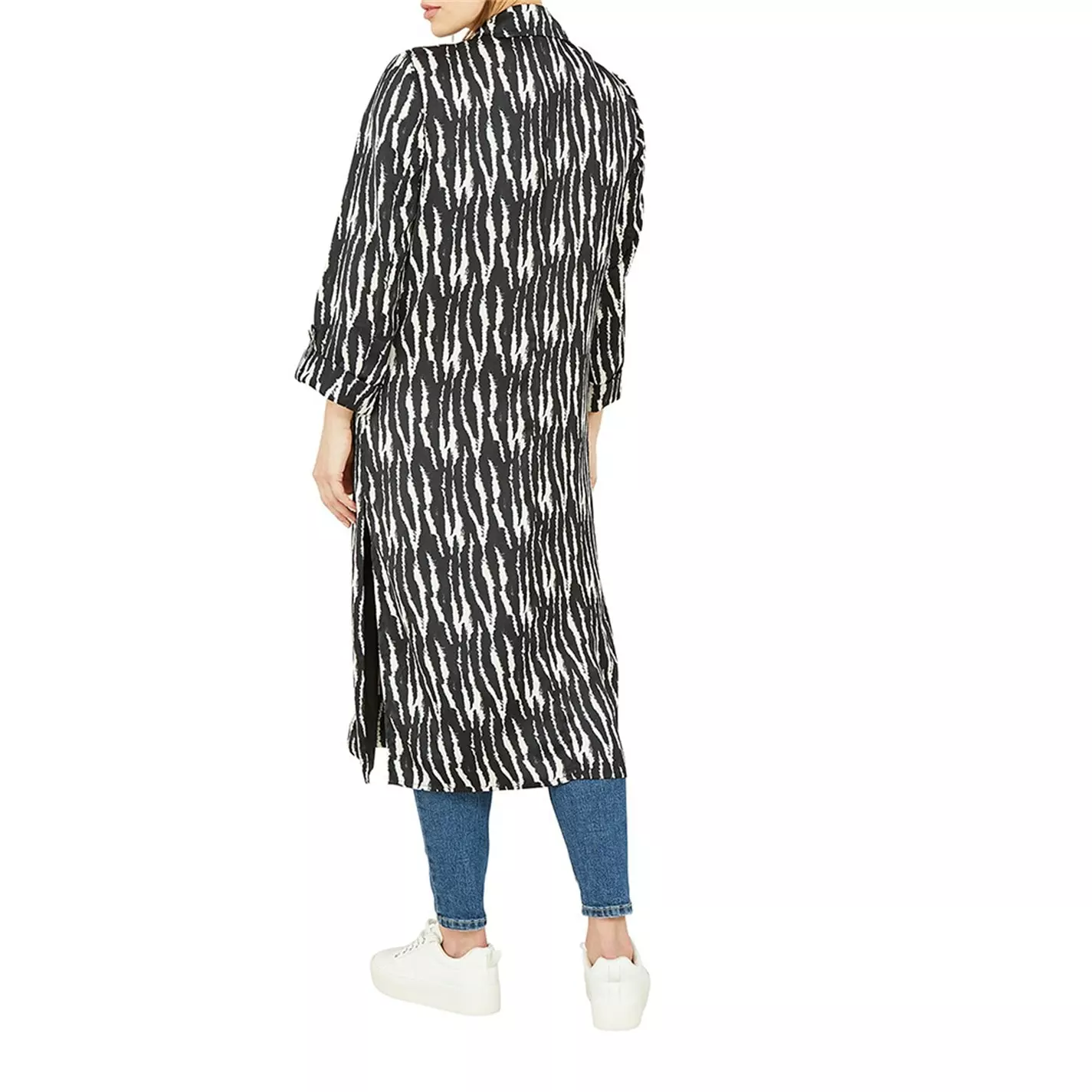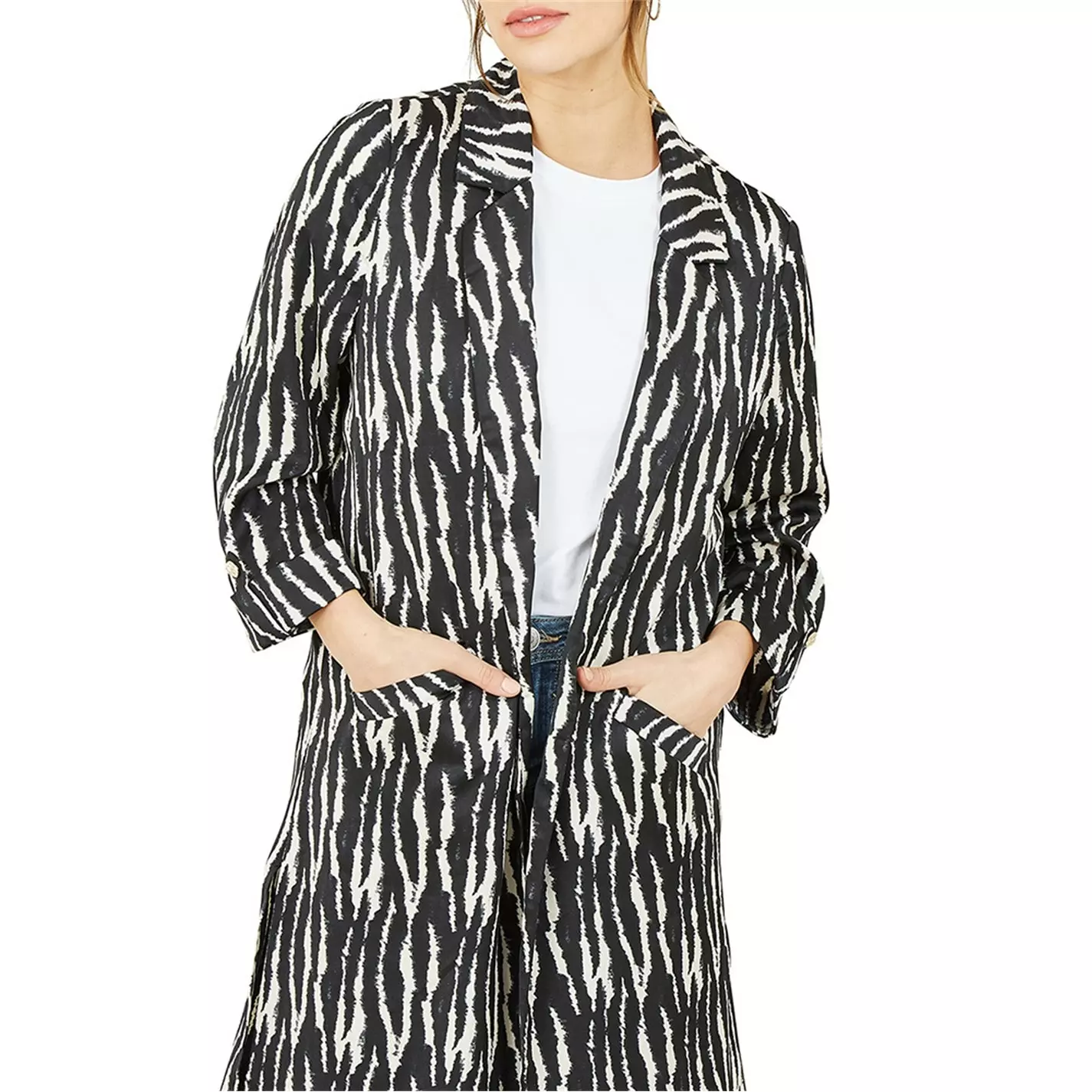 This Yumi Zebra Print Satin Long Kimono Jacket is perfect paired with a plain T-shirt, jeans, and your favourite trainers. With flattering 3/4 sleeves and pockets, as well as the statement long line shape, you will reach for this time and time again to add some edge to your spring wardrobe.